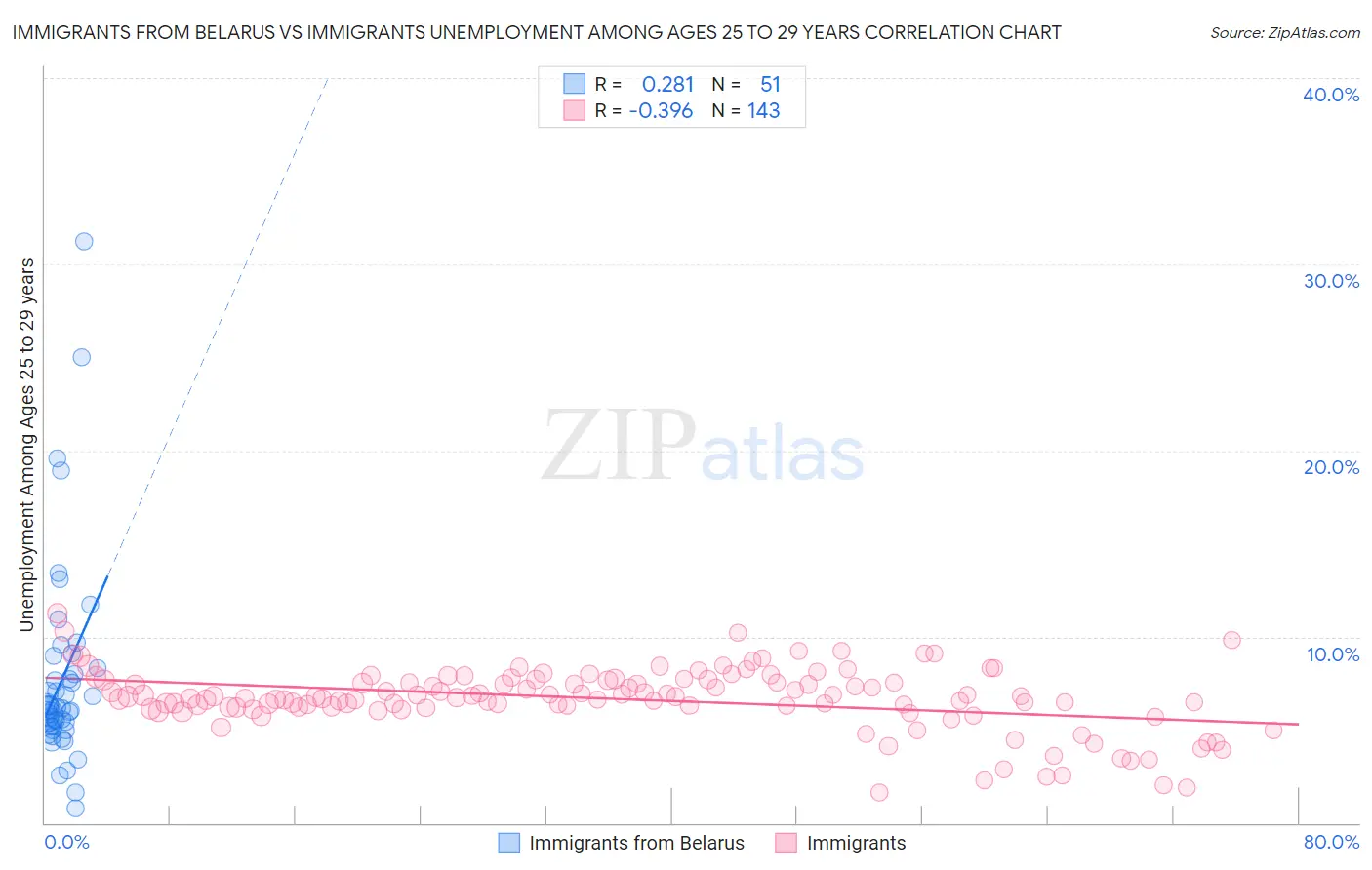 Immigrants from Belarus vs Immigrants Unemployment Among Ages 25 to 29 years Correlation Chart