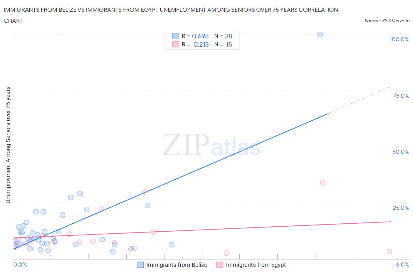 Immigrants from Belize vs Immigrants from Egypt Unemployment Among Seniors over 75 years Correlation Chart