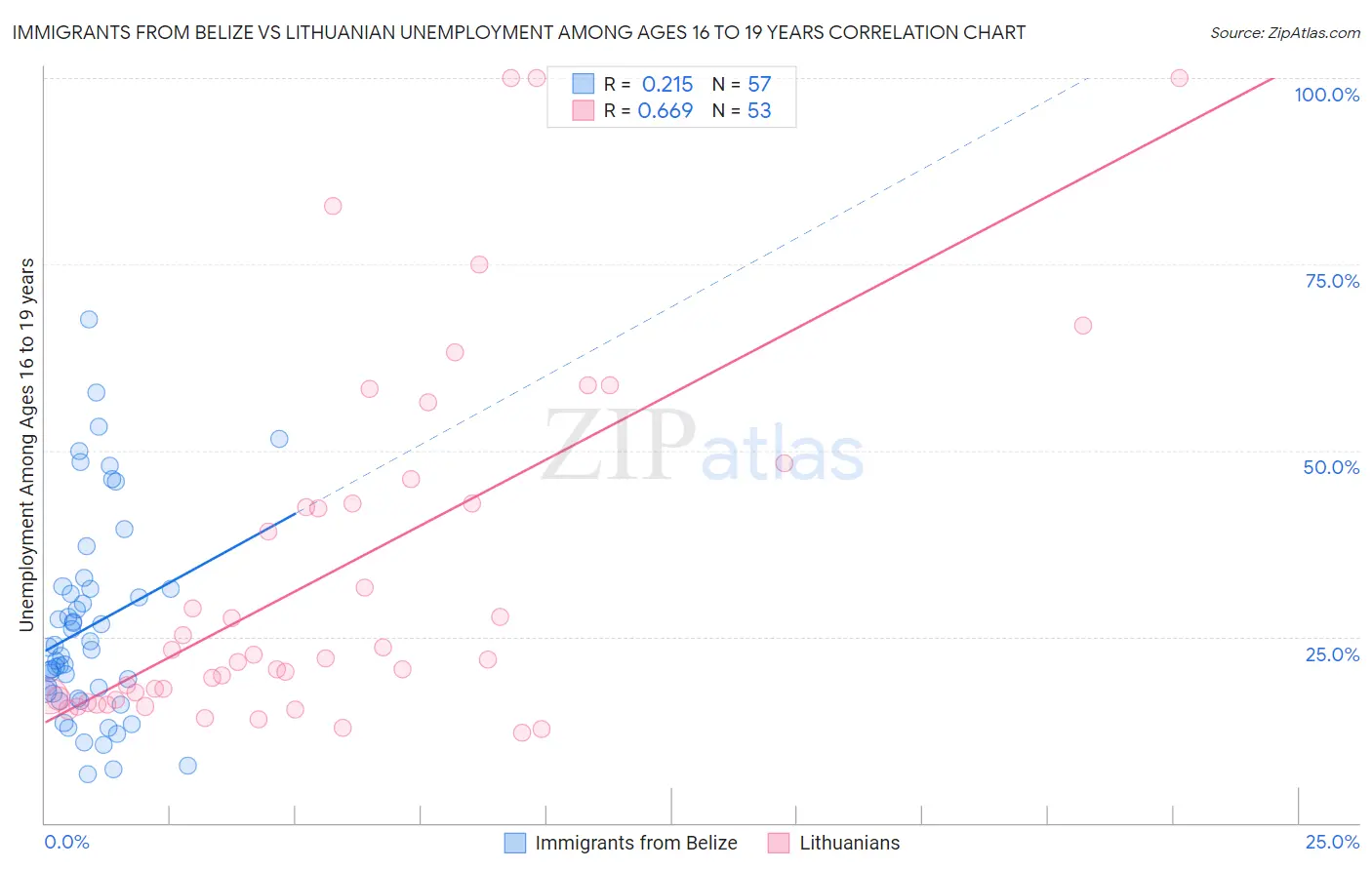Immigrants from Belize vs Lithuanian Unemployment Among Ages 16 to 19 years Correlation Chart