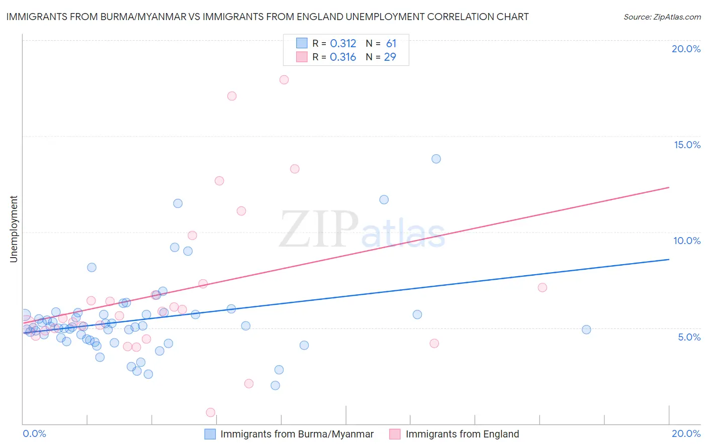 Immigrants from Burma/Myanmar vs Immigrants from England Unemployment Correlation Chart