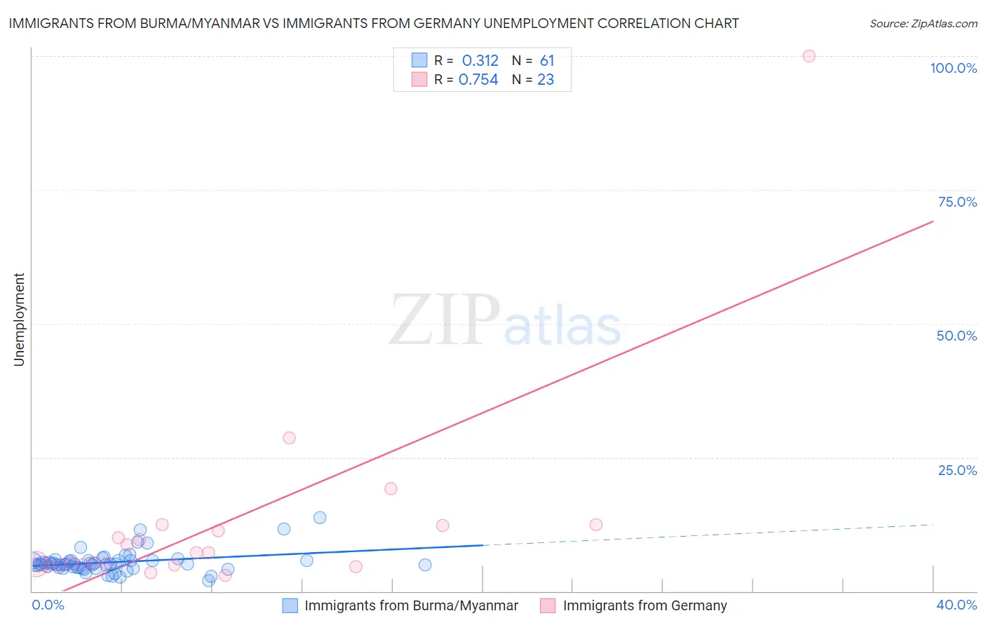 Immigrants from Burma/Myanmar vs Immigrants from Germany Unemployment Correlation Chart