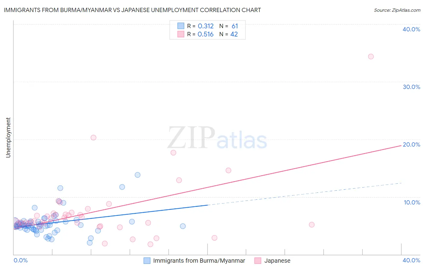 Immigrants from Burma/Myanmar vs Japanese Unemployment Correlation Chart