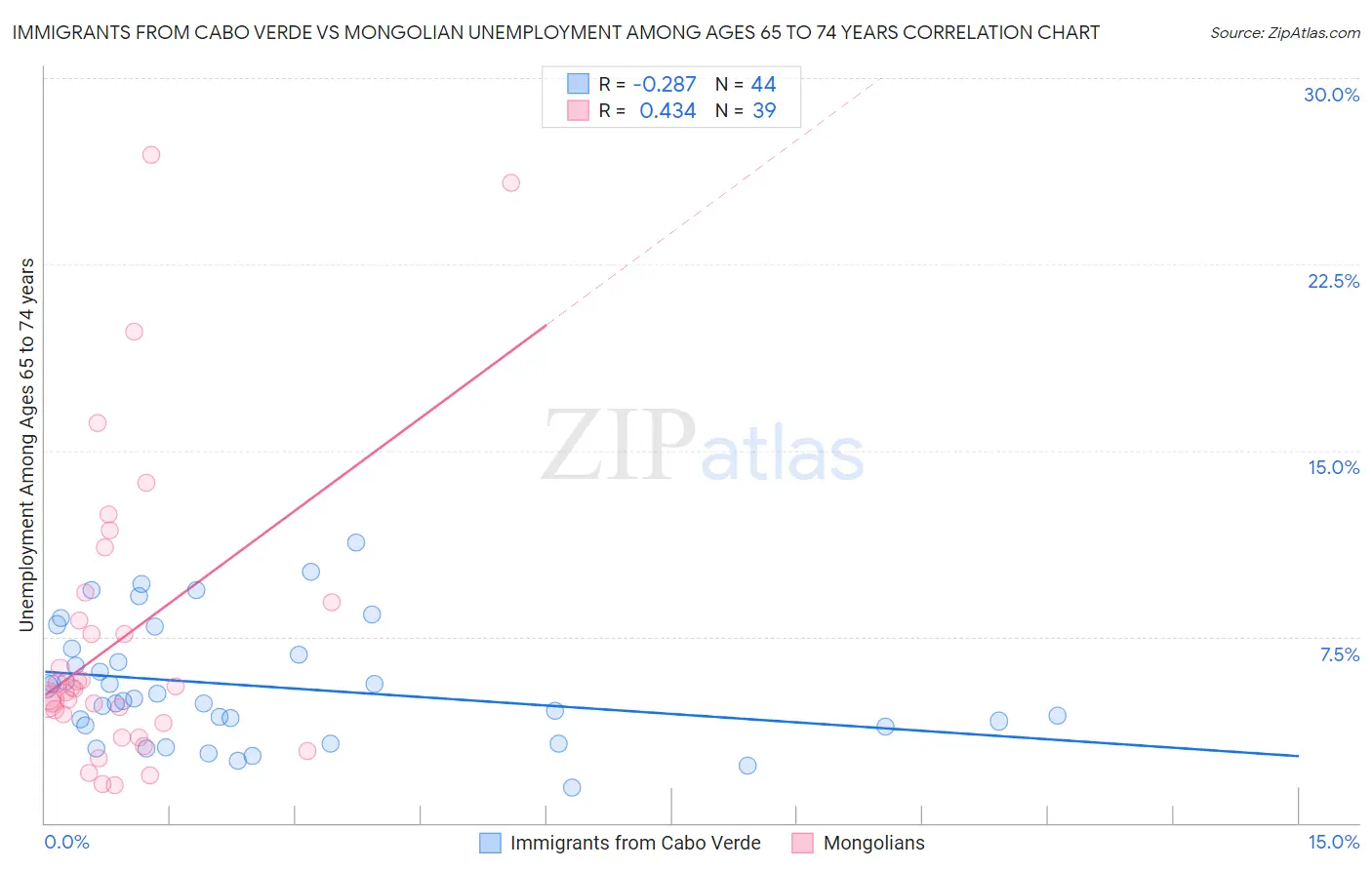 Immigrants from Cabo Verde vs Mongolian Unemployment Among Ages 65 to 74 years Correlation Chart