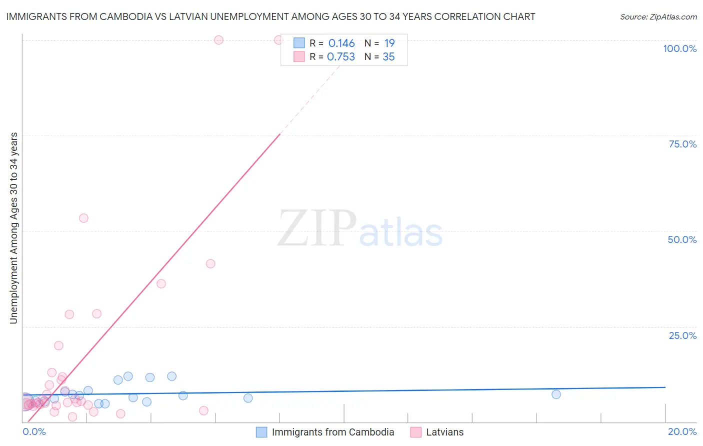 Immigrants from Cambodia vs Latvian Unemployment Among Ages 30 to 34 years Correlation Chart