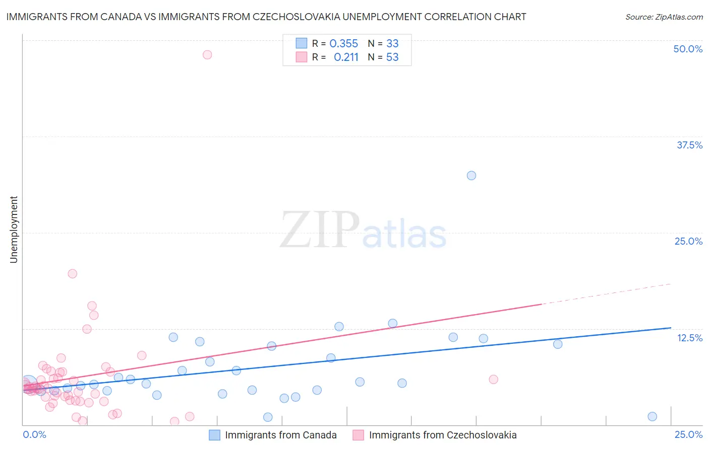 Immigrants from Canada vs Immigrants from Czechoslovakia Unemployment Correlation Chart
