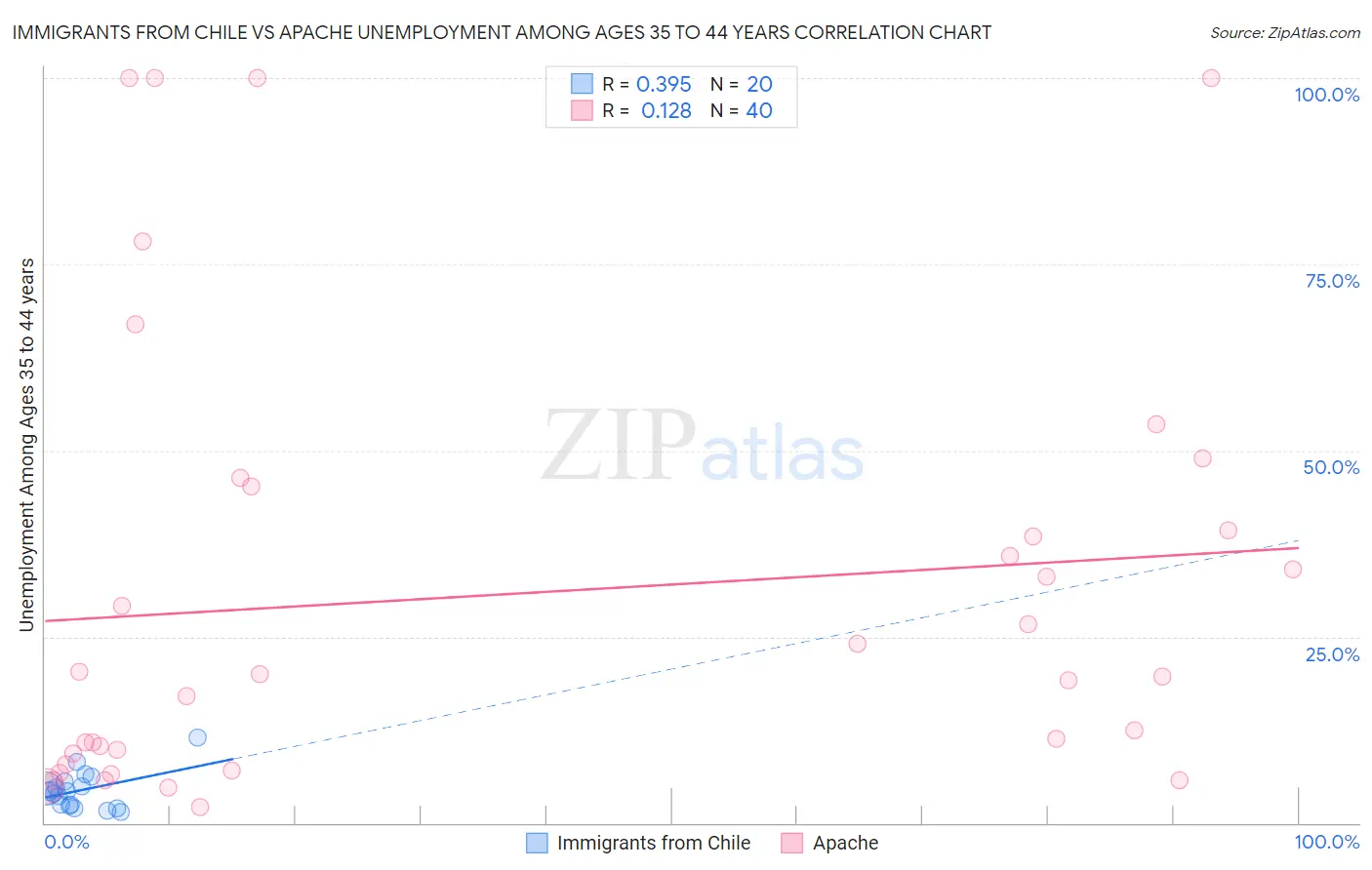 Immigrants from Chile vs Apache Unemployment Among Ages 35 to 44 years Correlation Chart