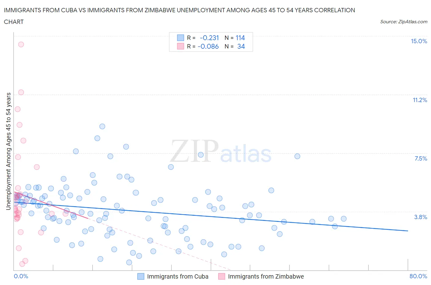 Immigrants from Cuba vs Immigrants from Zimbabwe Unemployment Among Ages 45 to 54 years Correlation Chart