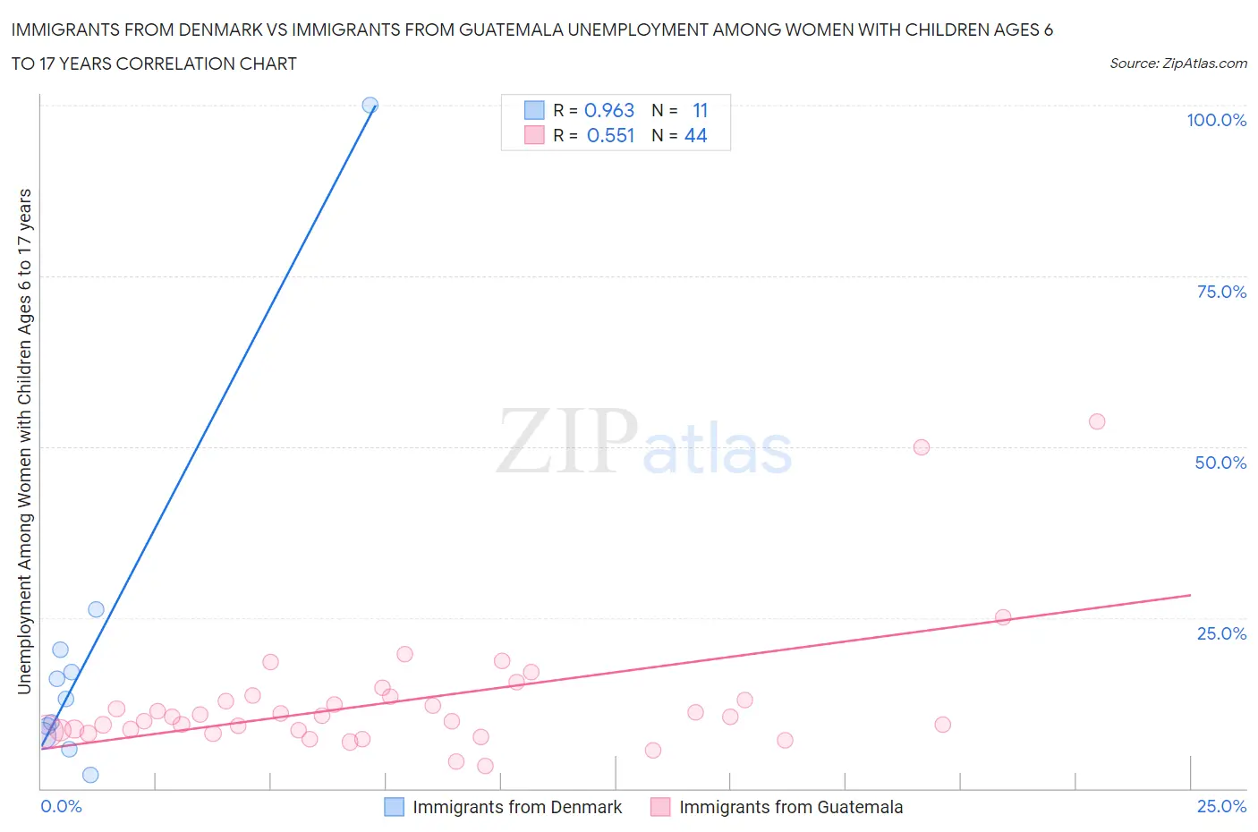 Immigrants from Denmark vs Immigrants from Guatemala Unemployment Among Women with Children Ages 6 to 17 years Correlation Chart