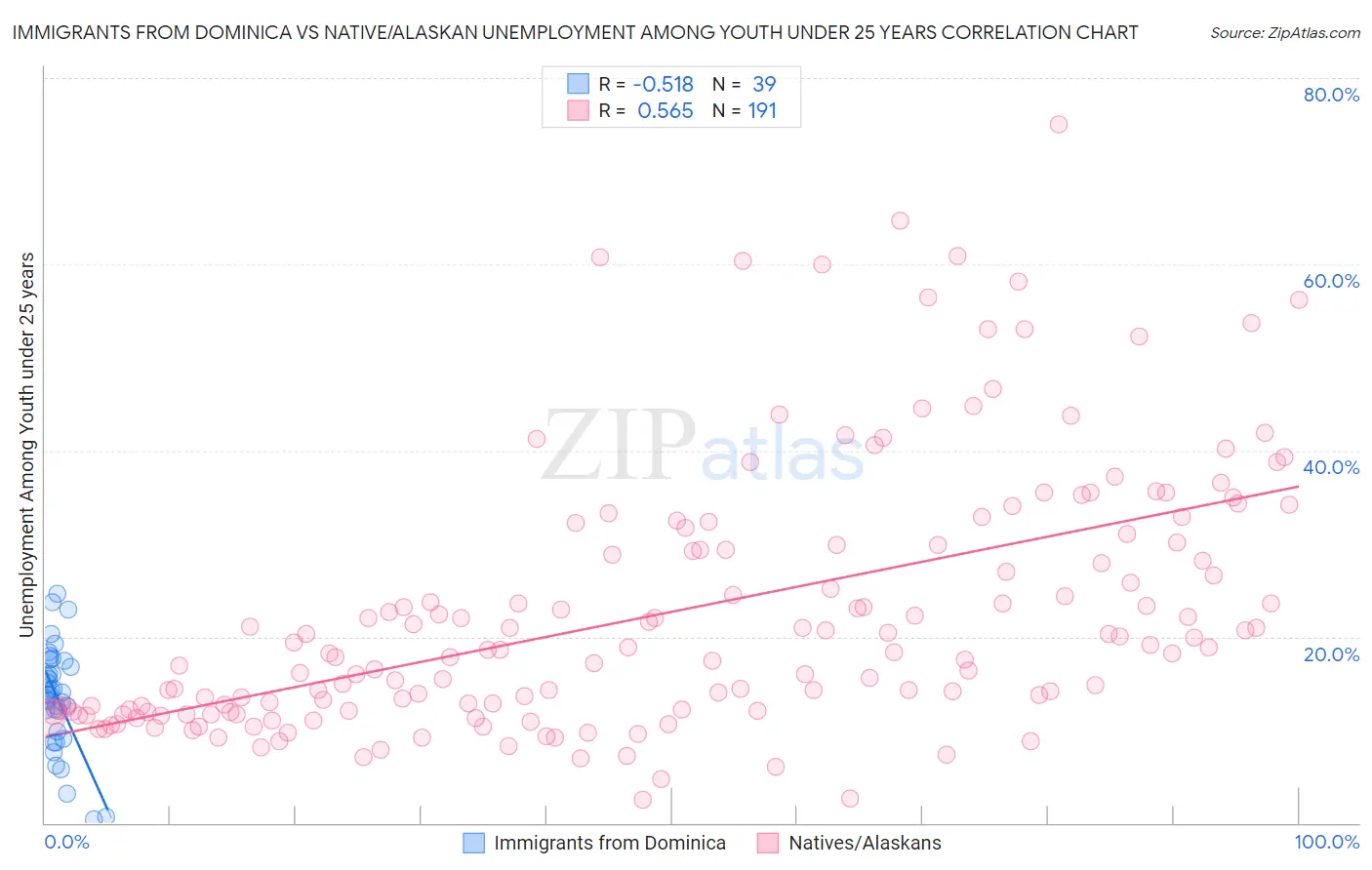 Immigrants from Dominica vs Native/Alaskan Unemployment Among Youth under 25 years Correlation Chart