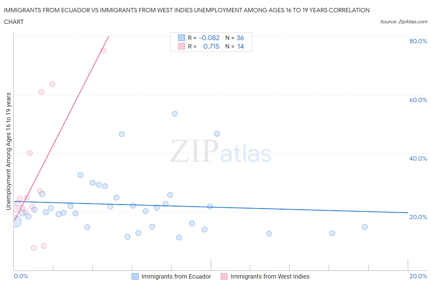 Immigrants from Ecuador vs Immigrants from West Indies Unemployment Among Ages 16 to 19 years Correlation Chart