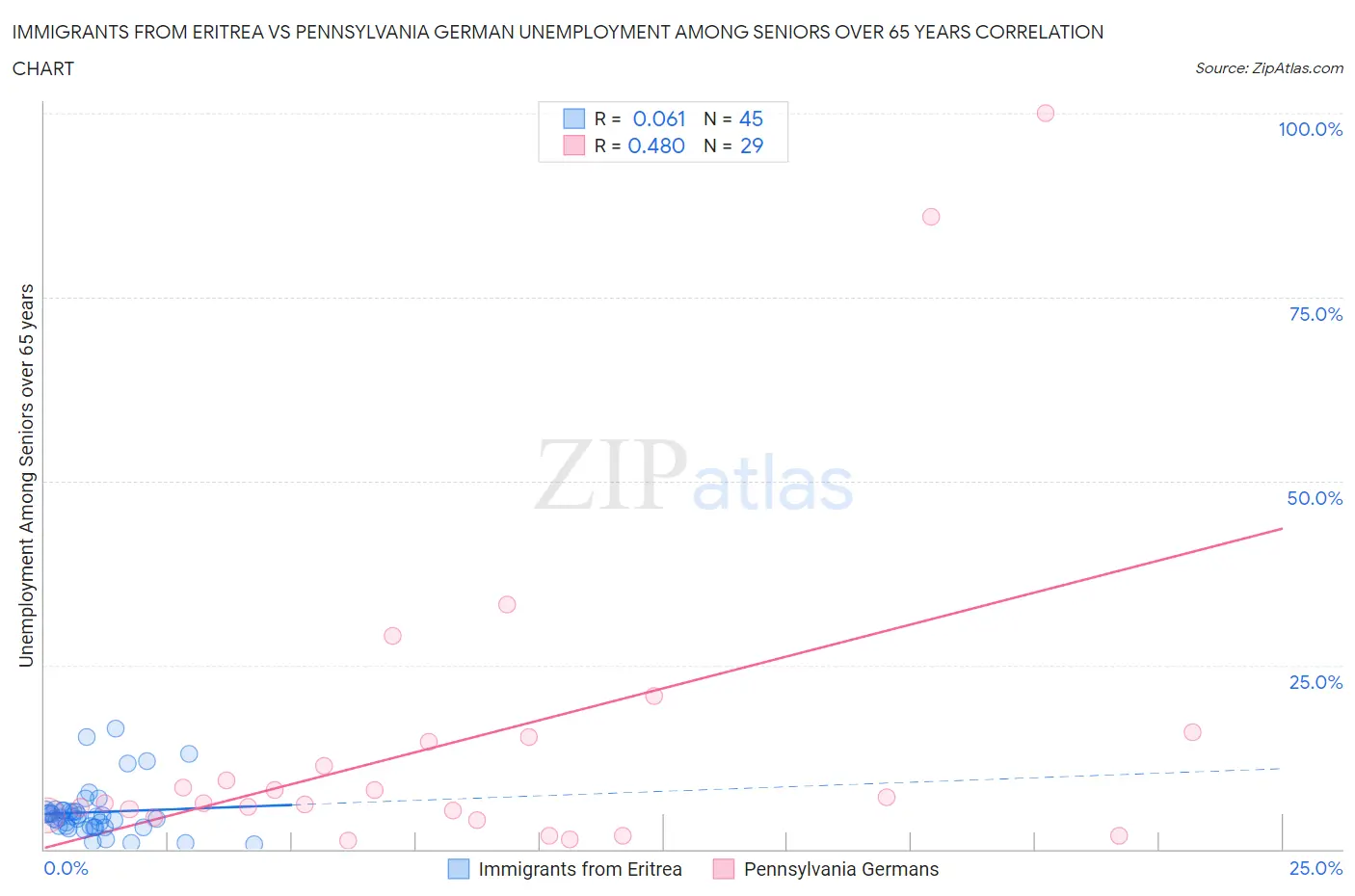Immigrants from Eritrea vs Pennsylvania German Unemployment Among Seniors over 65 years Correlation Chart