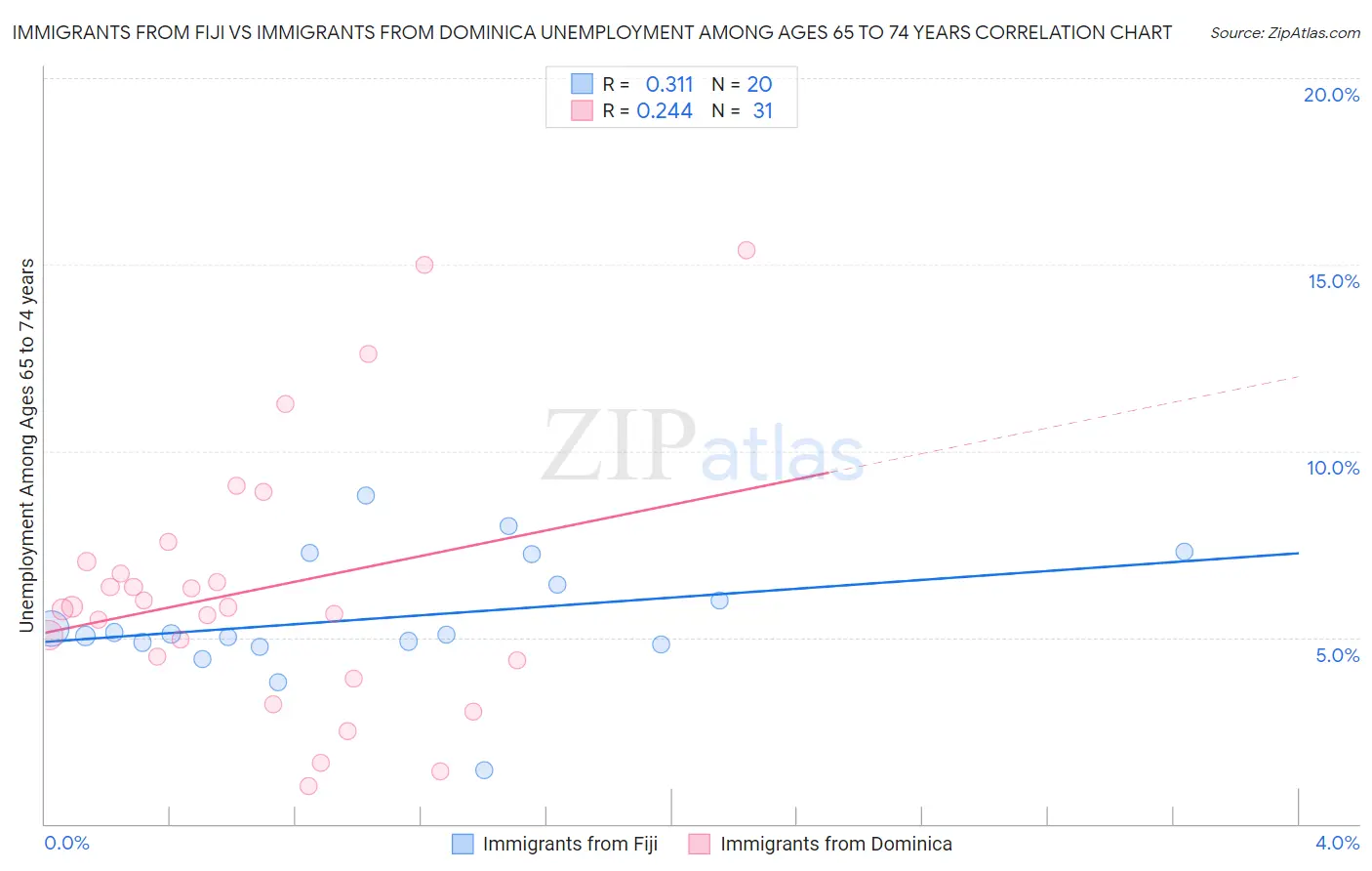 Immigrants from Fiji vs Immigrants from Dominica Unemployment Among Ages 65 to 74 years Correlation Chart