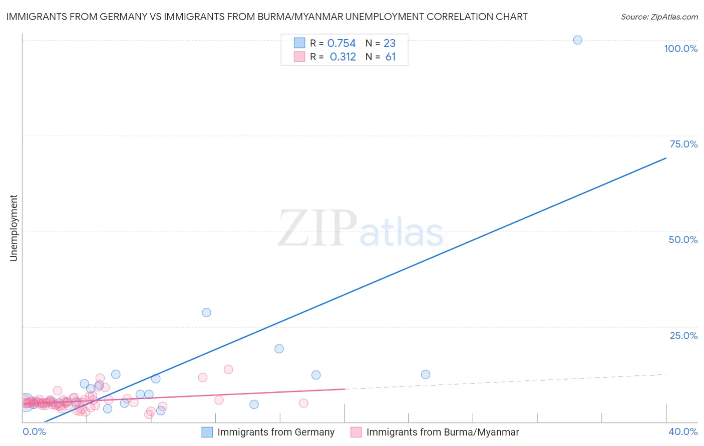Immigrants from Germany vs Immigrants from Burma/Myanmar Unemployment Correlation Chart