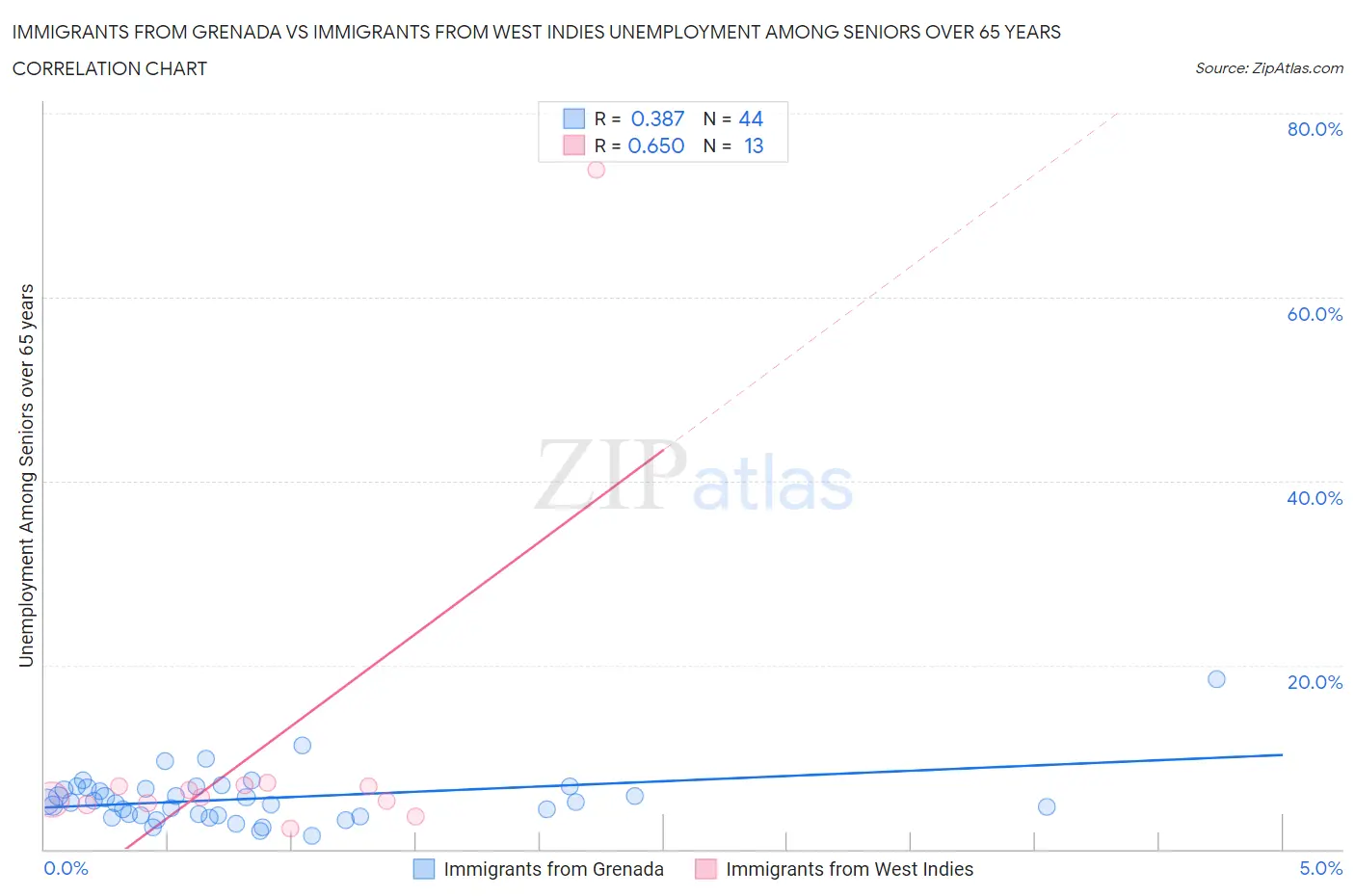 Immigrants from Grenada vs Immigrants from West Indies Unemployment Among Seniors over 65 years Correlation Chart