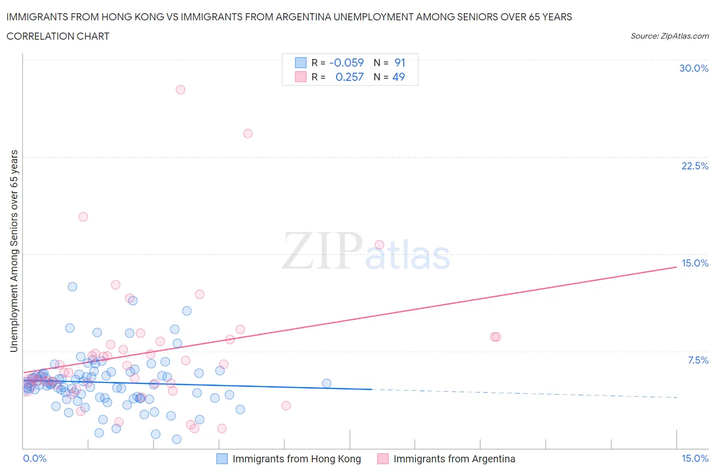 Immigrants from Hong Kong vs Immigrants from Argentina Unemployment Among Seniors over 65 years Correlation Chart