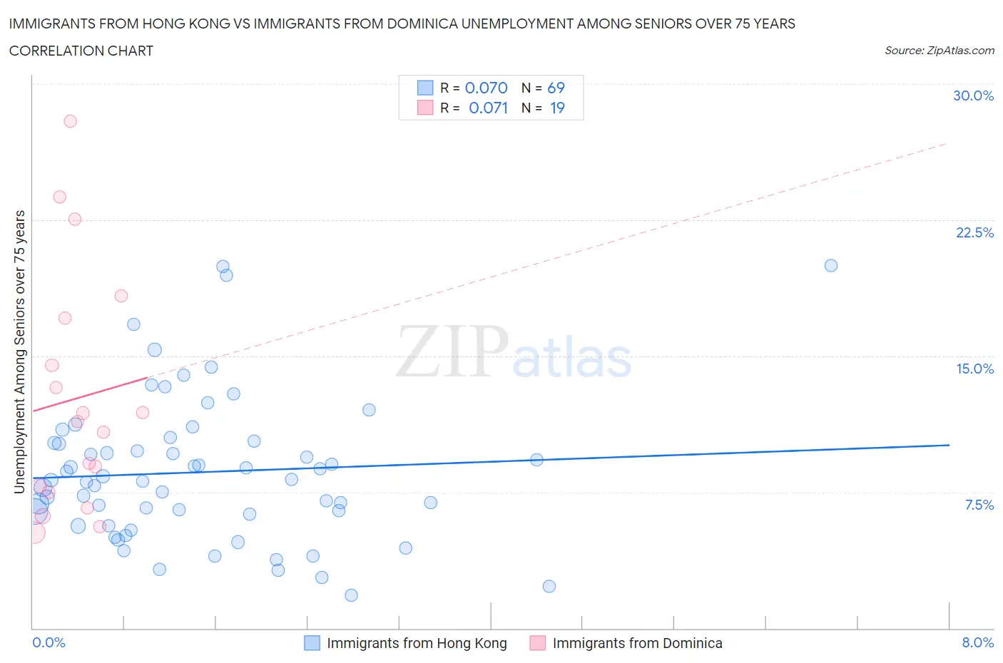 Immigrants from Hong Kong vs Immigrants from Dominica Unemployment Among Seniors over 75 years Correlation Chart