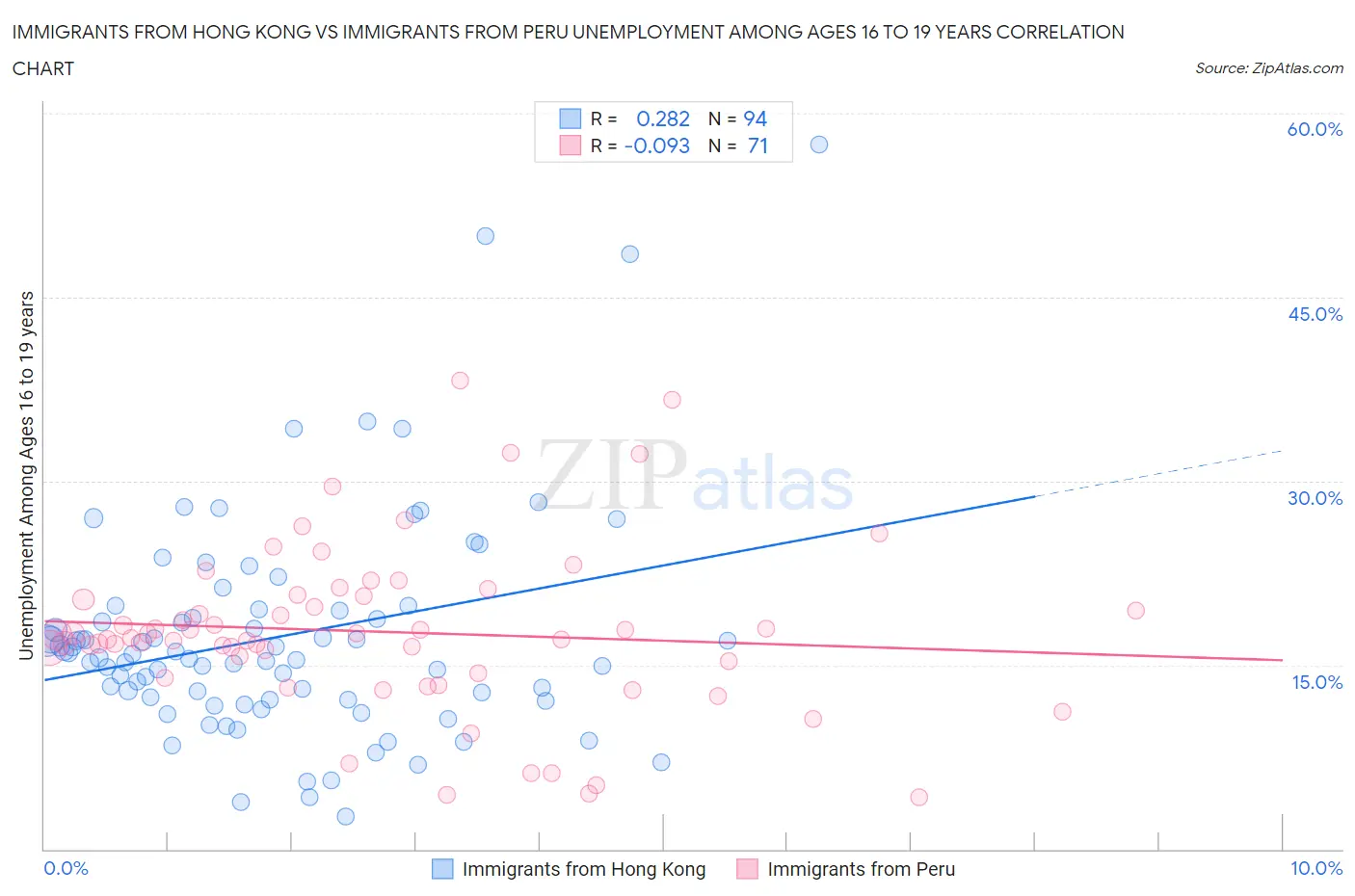 Immigrants from Hong Kong vs Immigrants from Peru Unemployment Among Ages 16 to 19 years Correlation Chart