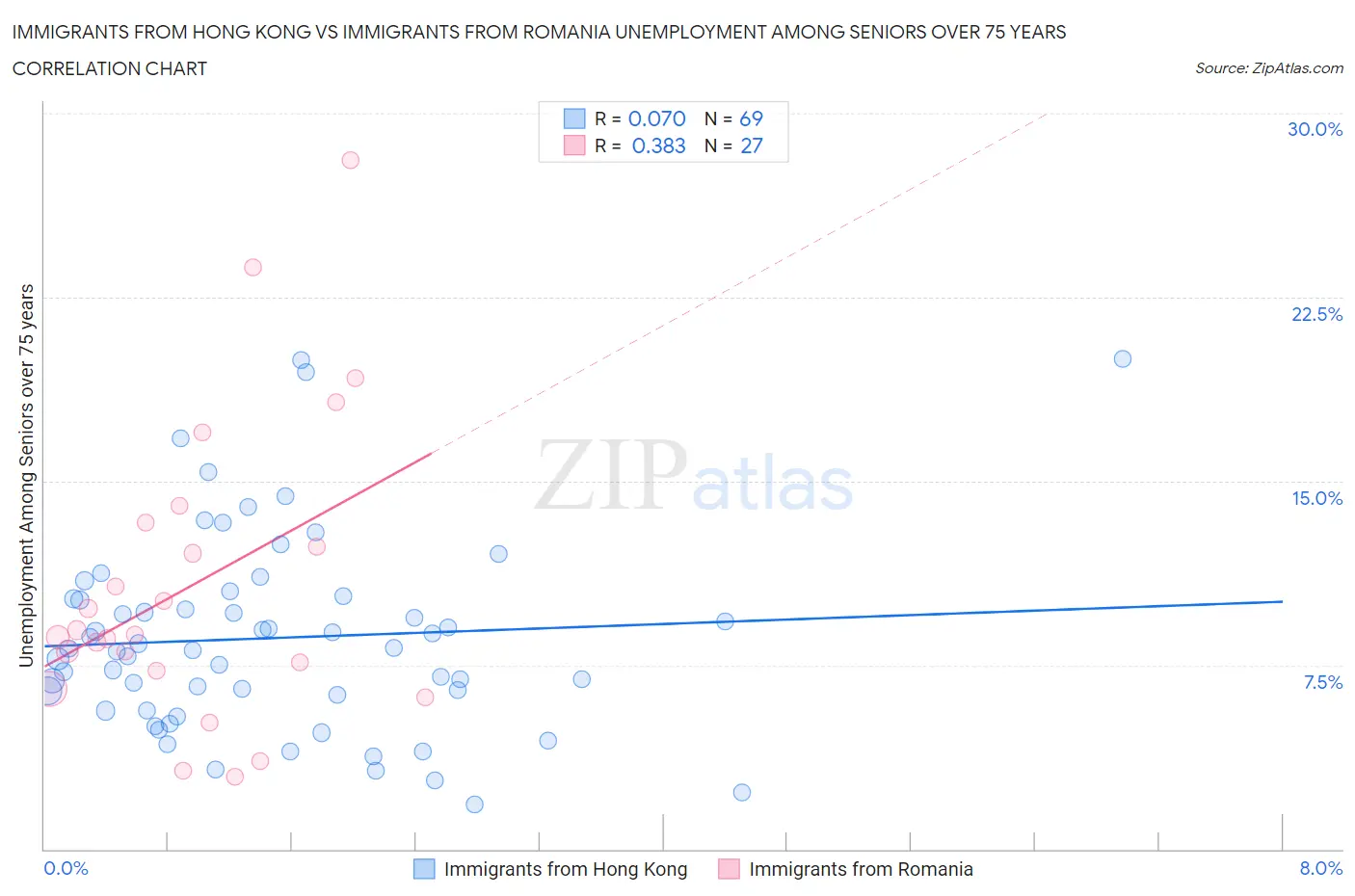 Immigrants from Hong Kong vs Immigrants from Romania Unemployment Among Seniors over 75 years Correlation Chart