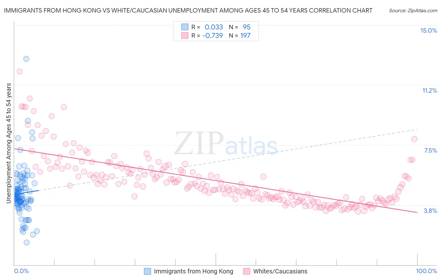 Immigrants from Hong Kong vs White/Caucasian Unemployment Among Ages 45 to 54 years Correlation Chart
