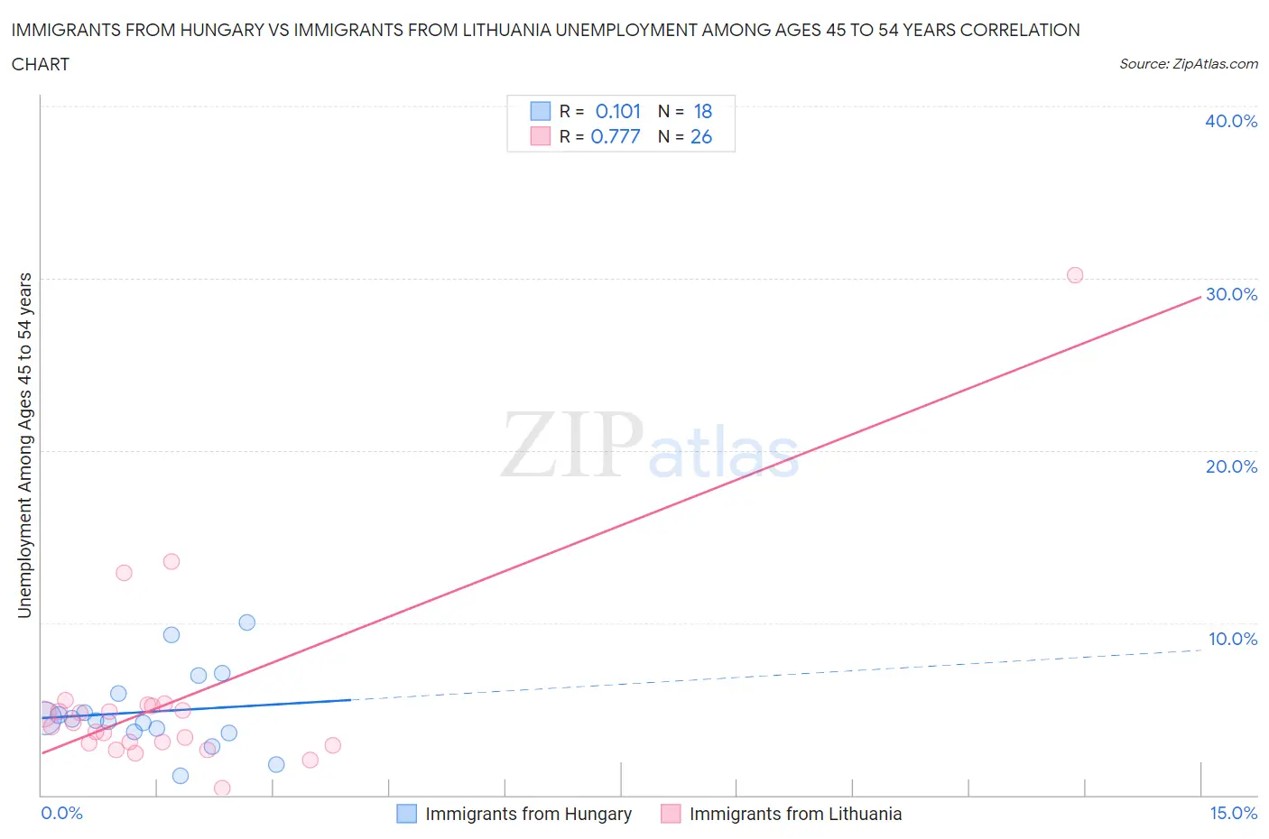 Immigrants from Hungary vs Immigrants from Lithuania Unemployment Among Ages 45 to 54 years Correlation Chart