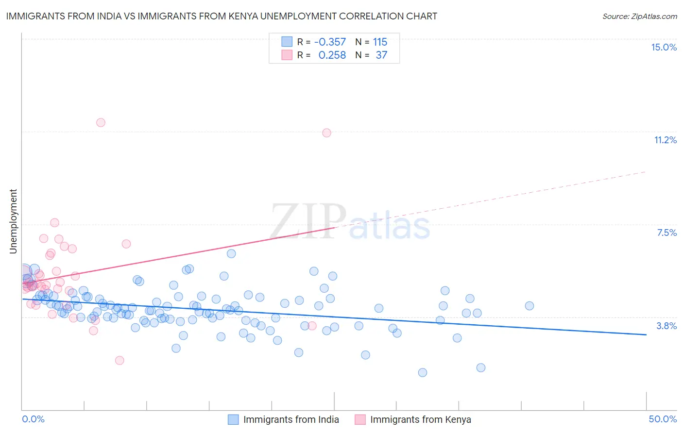 Immigrants from India vs Immigrants from Kenya Unemployment Correlation Chart