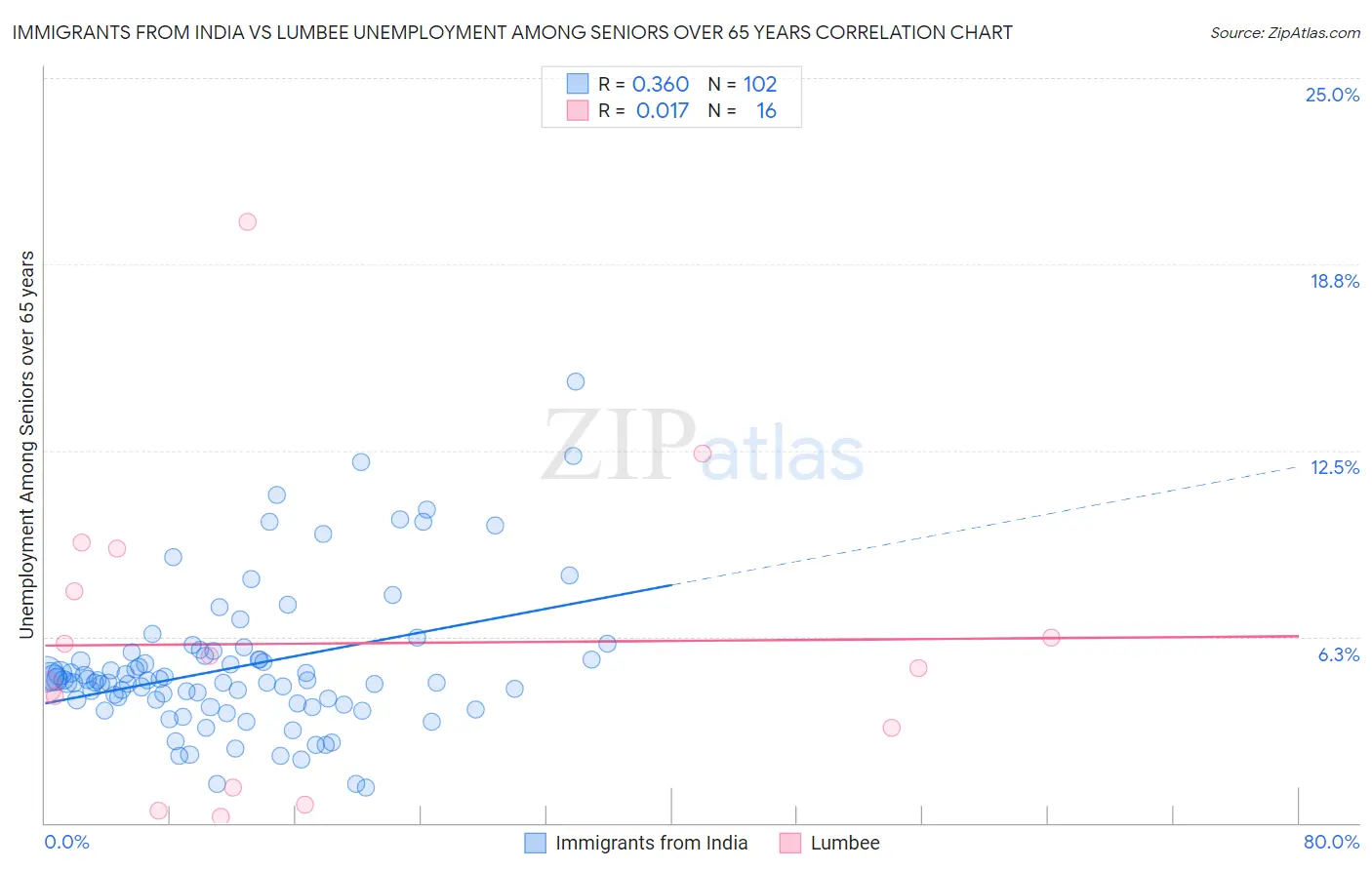 Immigrants from India vs Lumbee Unemployment Among Seniors over 65 years Correlation Chart