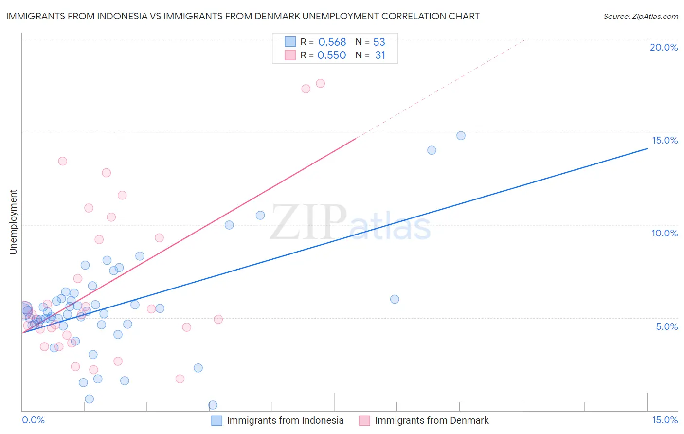 Immigrants from Indonesia vs Immigrants from Denmark Unemployment Correlation Chart