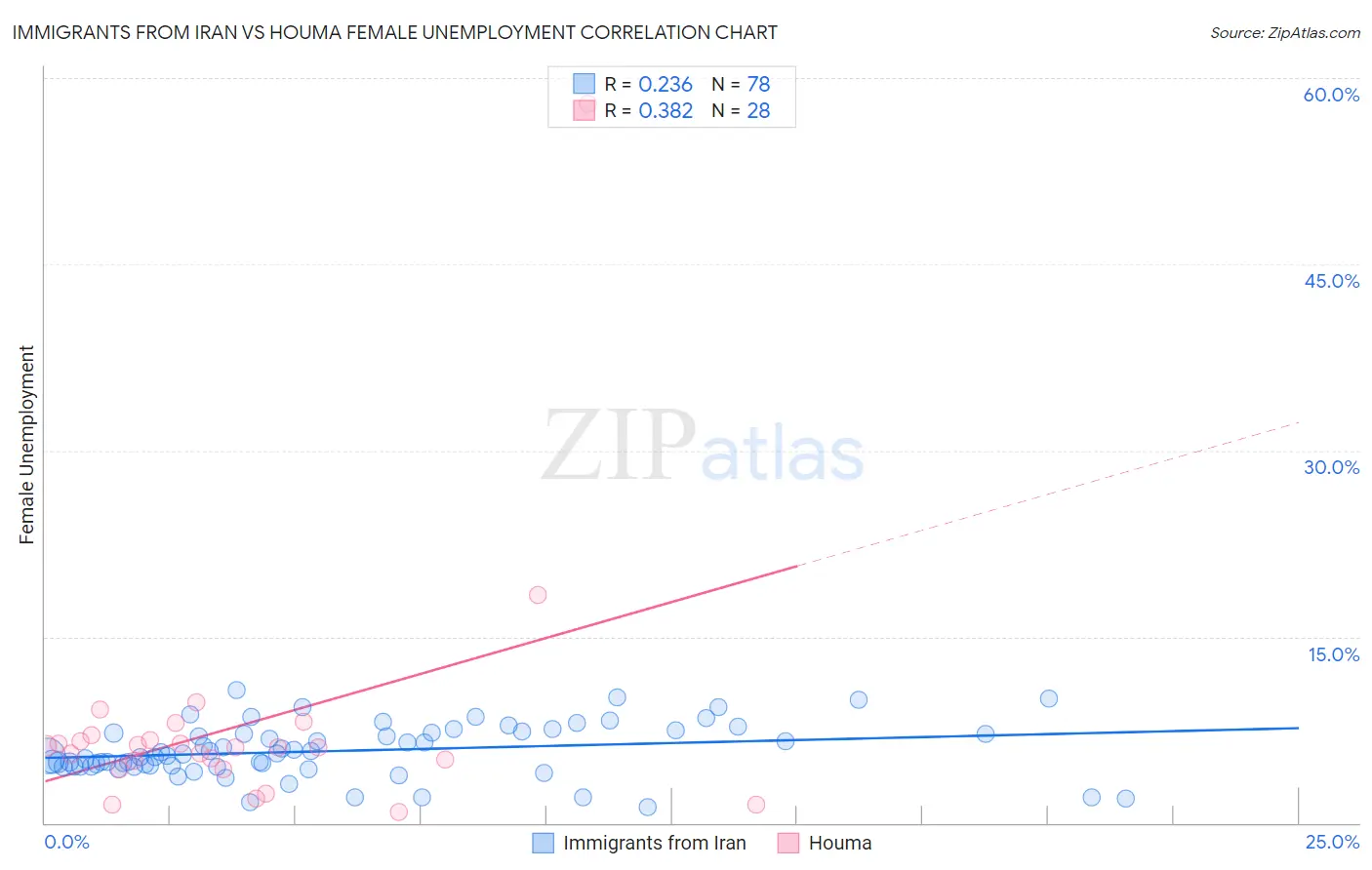 Immigrants from Iran vs Houma Female Unemployment Correlation Chart