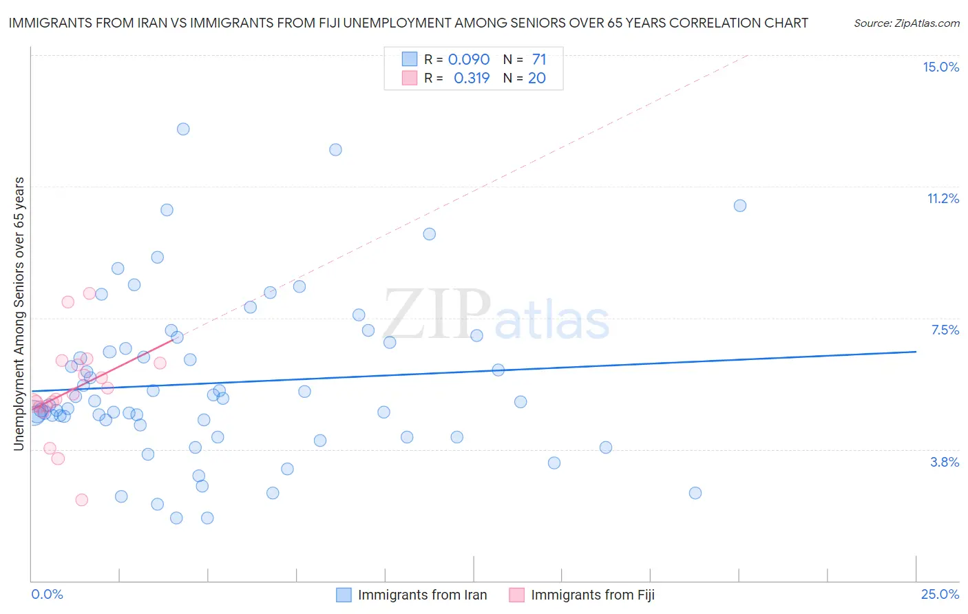 Immigrants from Iran vs Immigrants from Fiji Unemployment Among Seniors over 65 years Correlation Chart