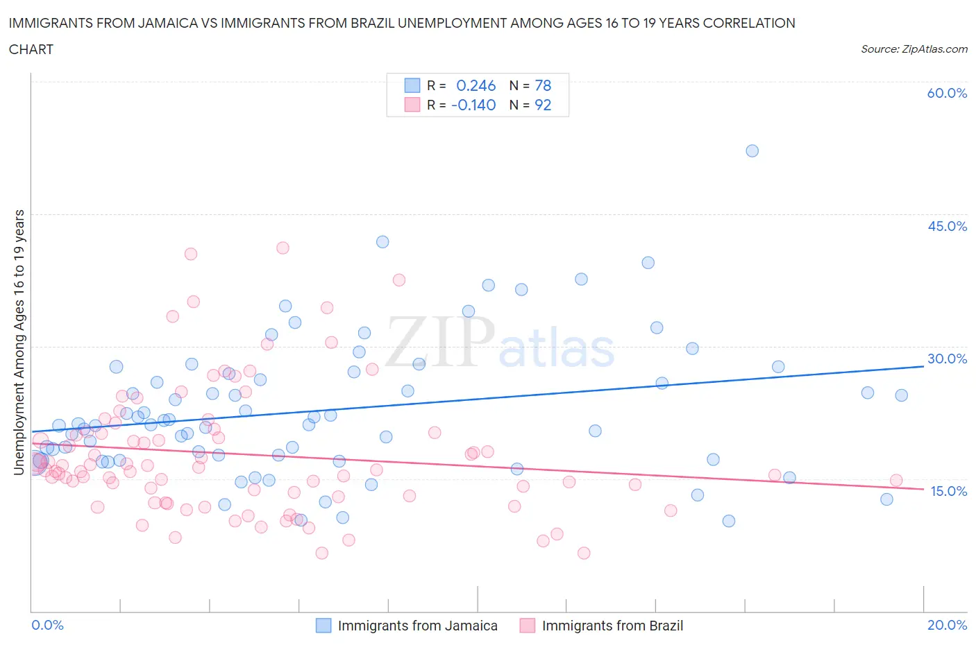 Immigrants from Jamaica vs Immigrants from Brazil Unemployment Among Ages 16 to 19 years Correlation Chart