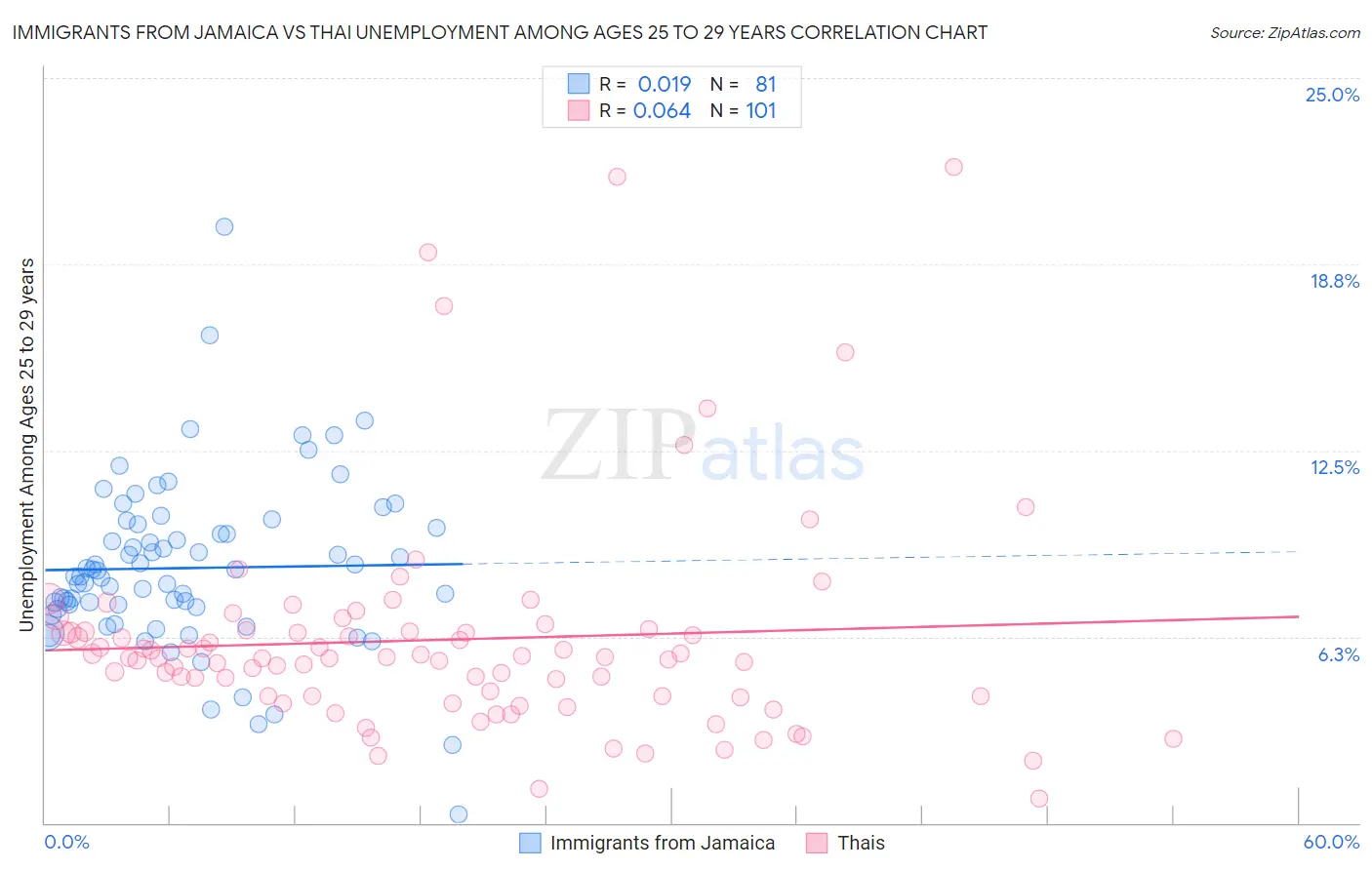 Immigrants from Jamaica vs Thai Unemployment Among Ages 25 to 29 years Correlation Chart