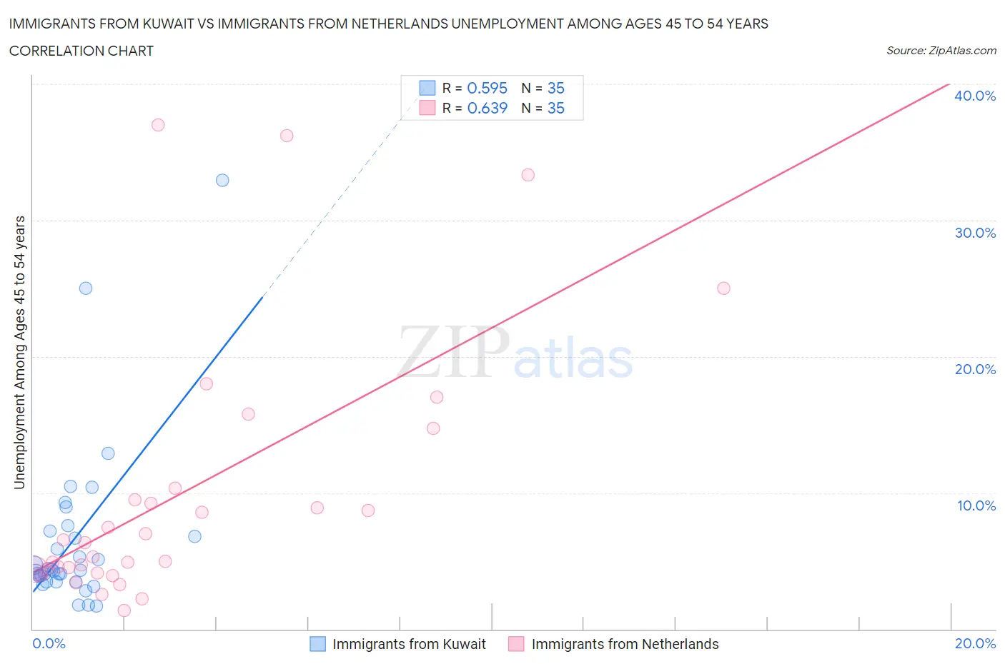 Immigrants from Kuwait vs Immigrants from Netherlands Unemployment Among Ages 45 to 54 years Correlation Chart