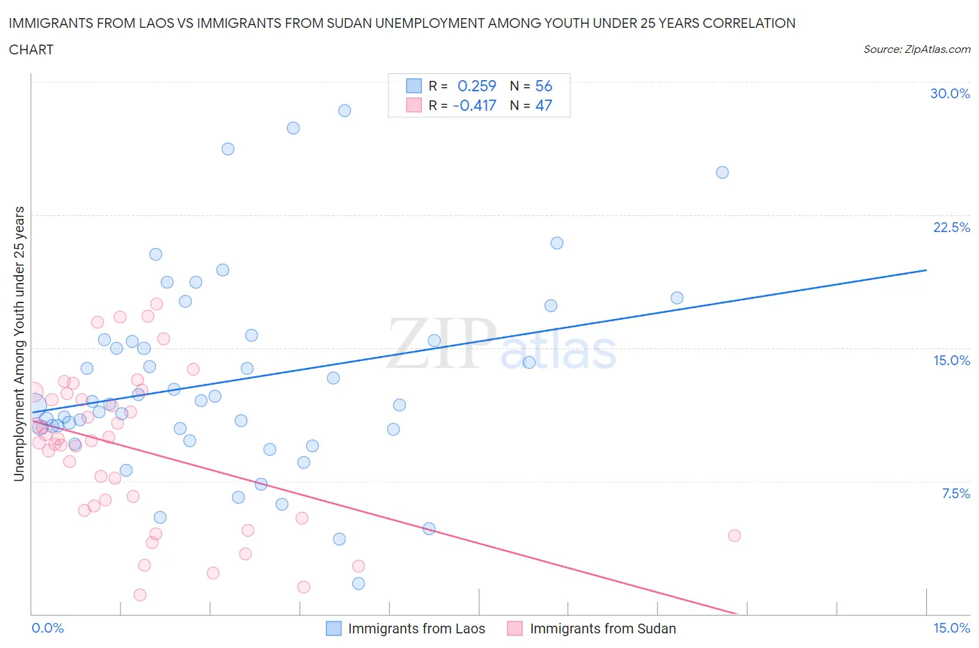 Immigrants from Laos vs Immigrants from Sudan Unemployment Among Youth under 25 years Correlation Chart