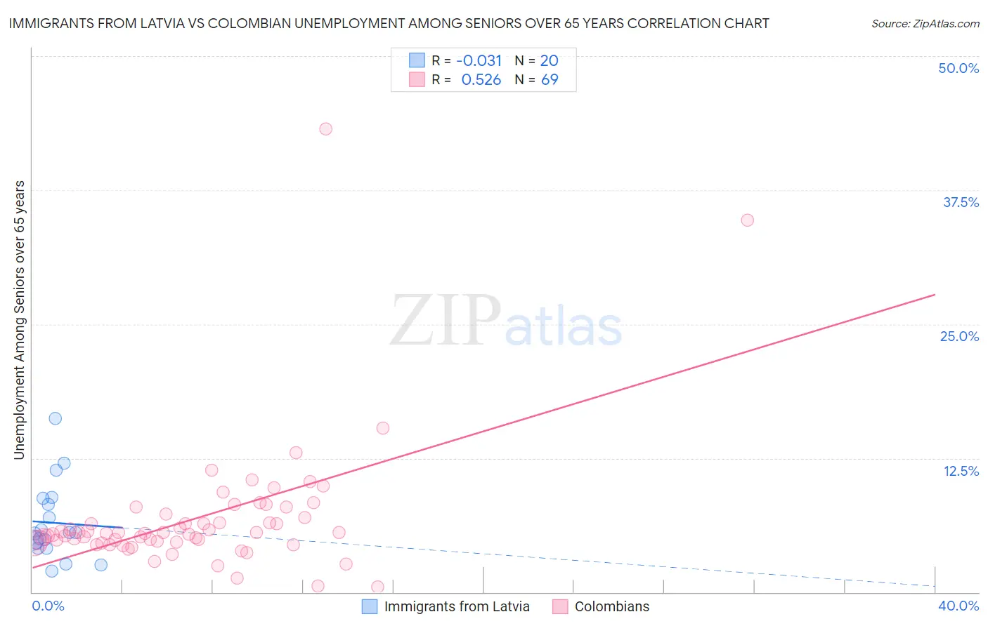 Immigrants from Latvia vs Colombian Unemployment Among Seniors over 65 years Correlation Chart