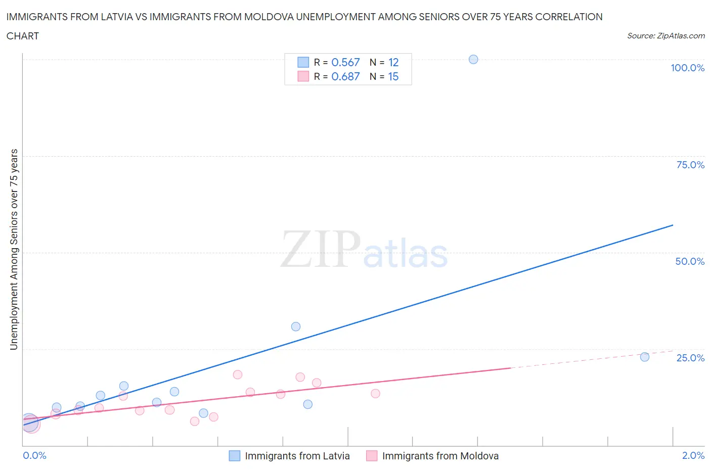 Immigrants from Latvia vs Immigrants from Moldova Unemployment Among Seniors over 75 years Correlation Chart