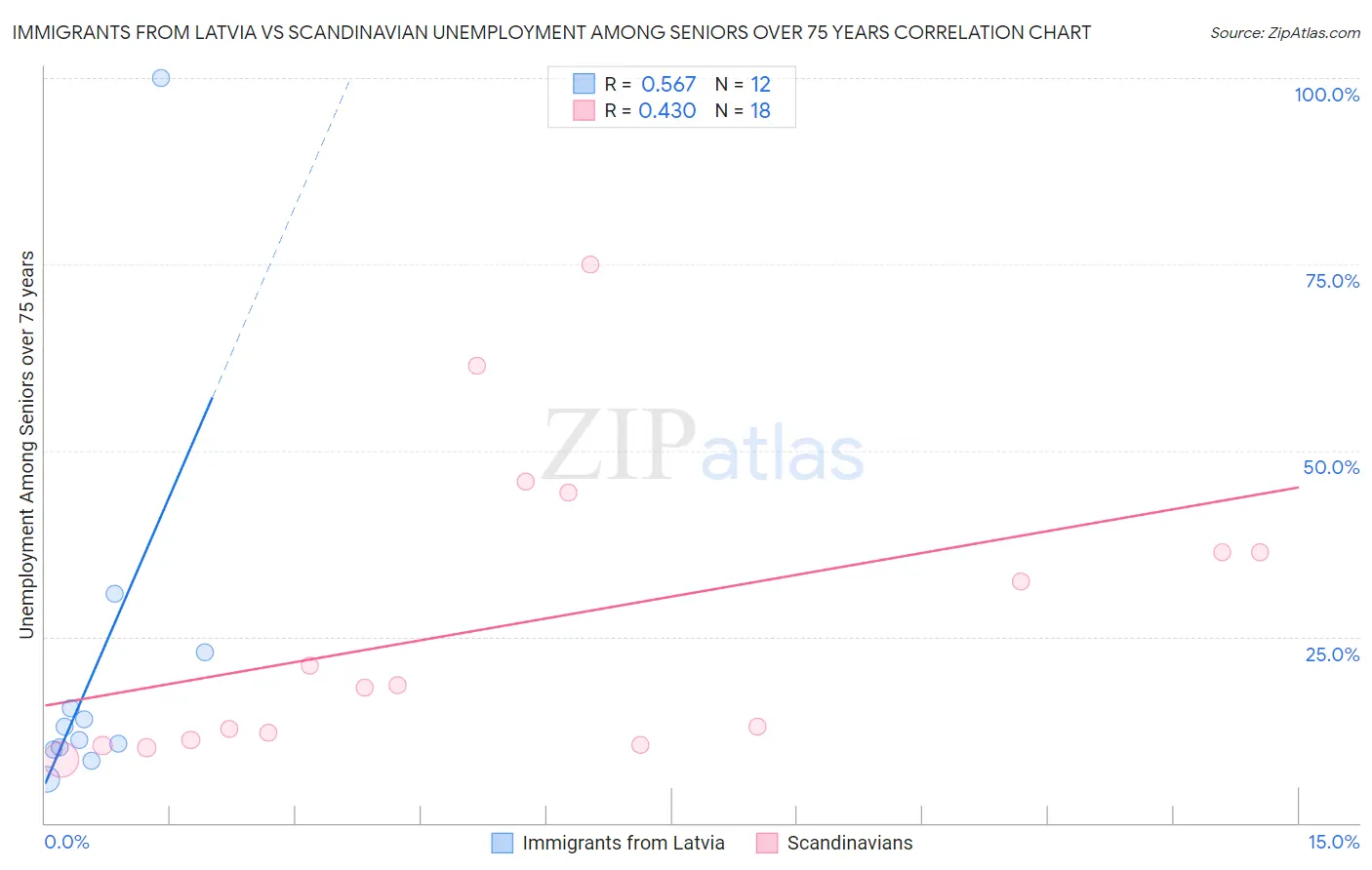 Immigrants from Latvia vs Scandinavian Unemployment Among Seniors over 75 years Correlation Chart
