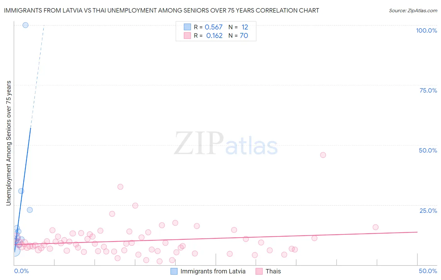 Immigrants from Latvia vs Thai Unemployment Among Seniors over 75 years Correlation Chart