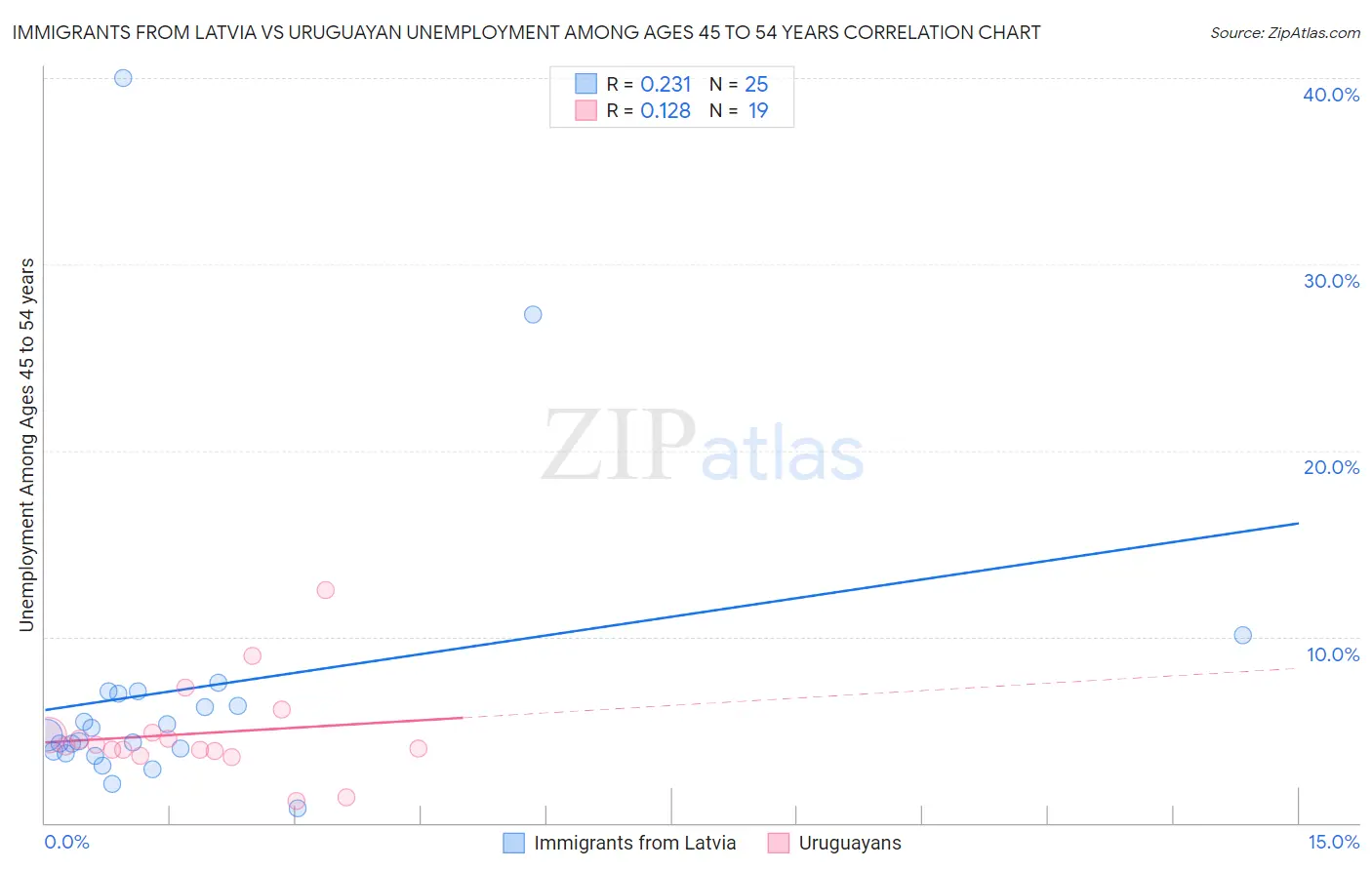 Immigrants from Latvia vs Uruguayan Unemployment Among Ages 45 to 54 years Correlation Chart