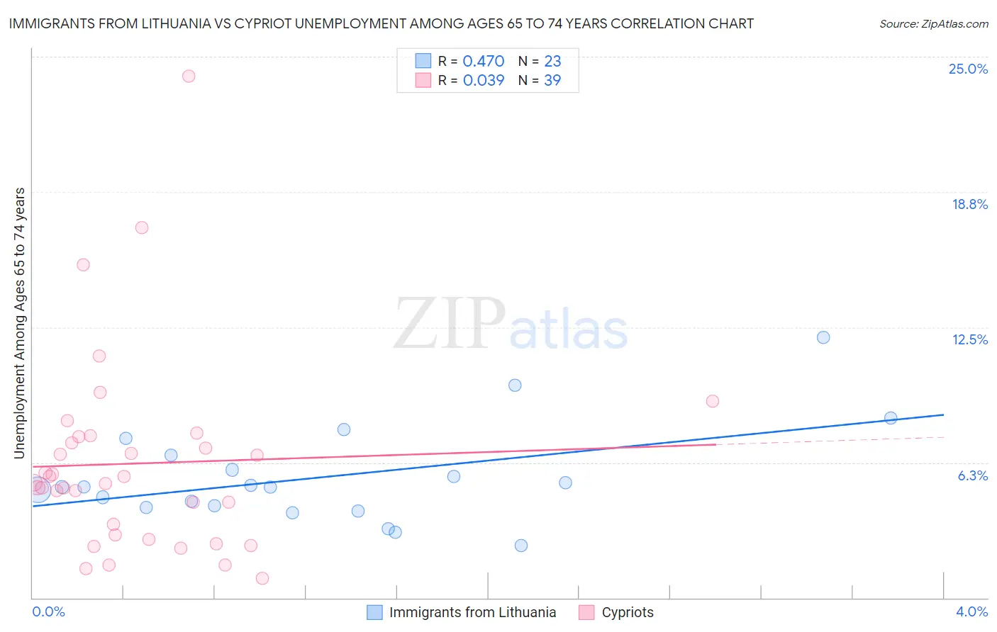 Immigrants from Lithuania vs Cypriot Unemployment Among Ages 65 to 74 years Correlation Chart
