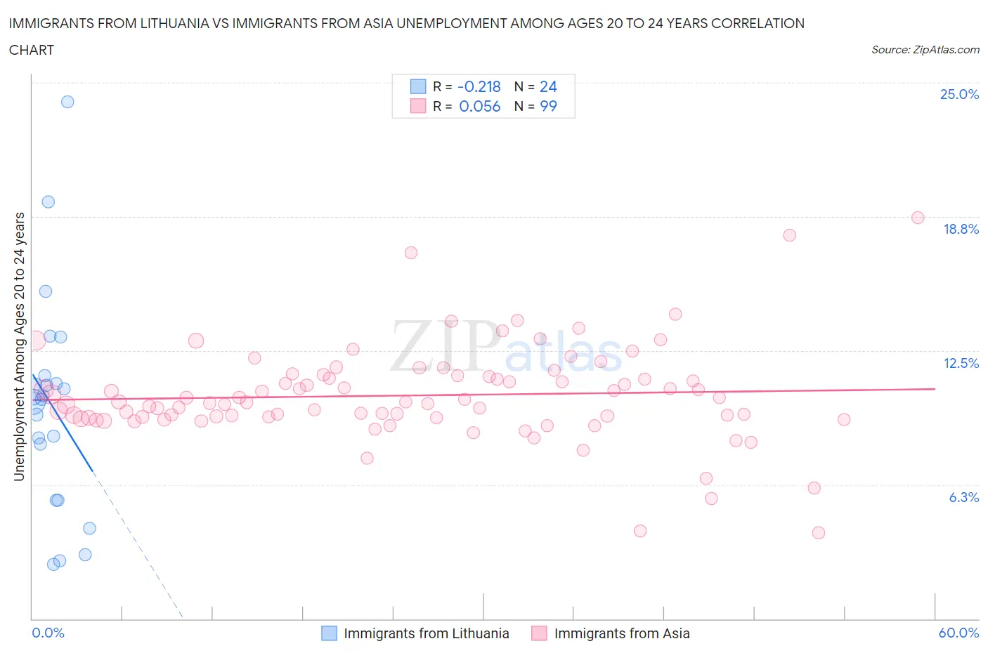 Immigrants from Lithuania vs Immigrants from Asia Unemployment Among Ages 20 to 24 years Correlation Chart