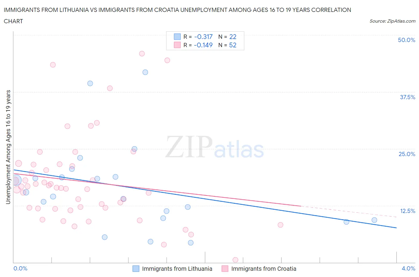 Immigrants from Lithuania vs Immigrants from Croatia Unemployment Among Ages 16 to 19 years Correlation Chart