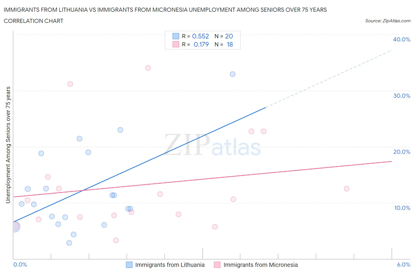 Immigrants from Lithuania vs Immigrants from Micronesia Unemployment Among Seniors over 75 years Correlation Chart