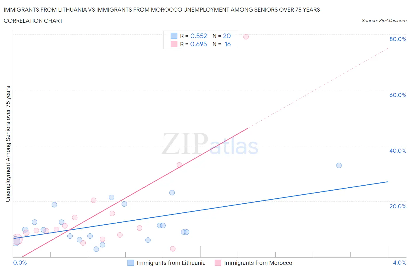 Immigrants from Lithuania vs Immigrants from Morocco Unemployment Among Seniors over 75 years Correlation Chart
