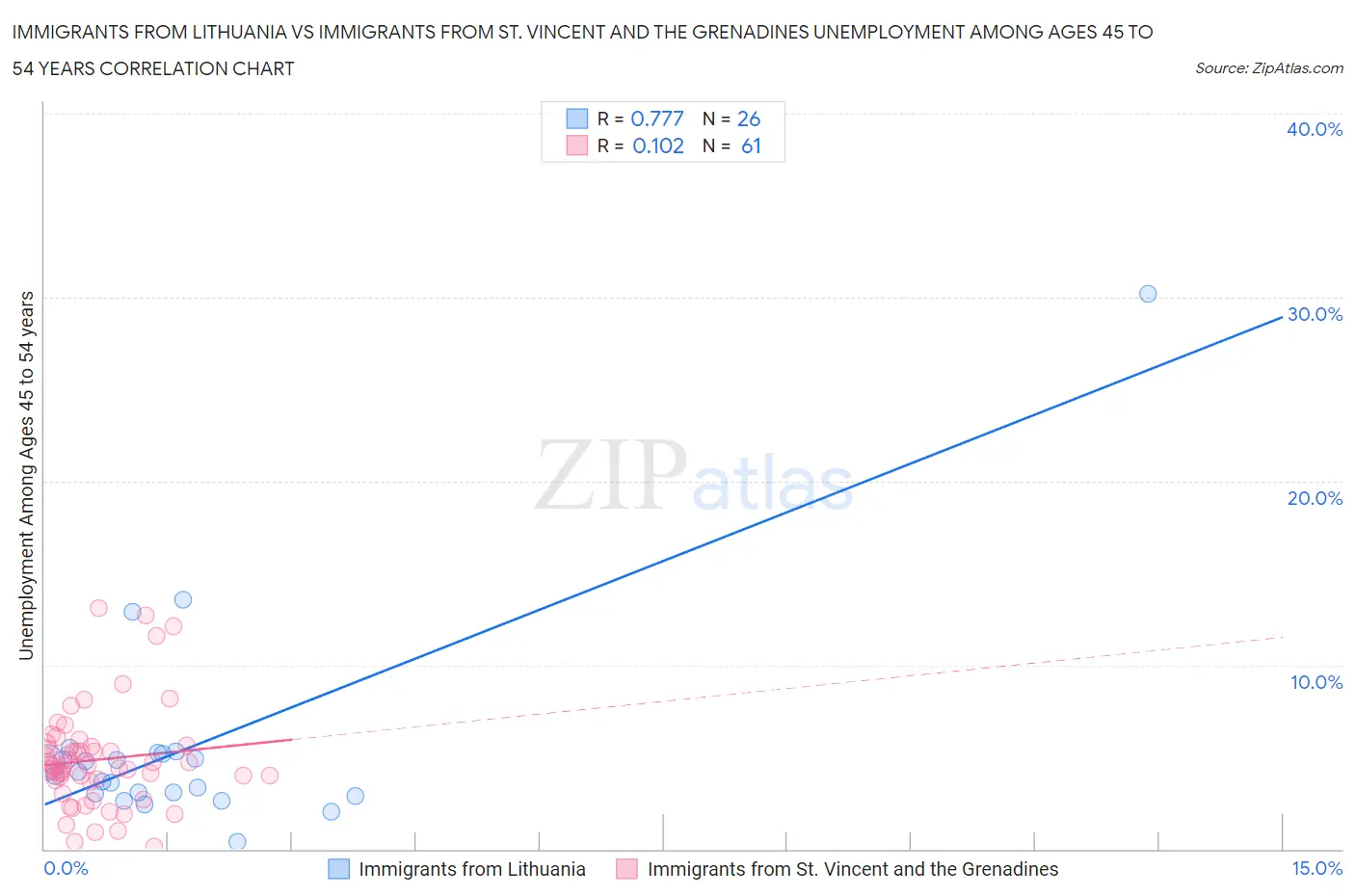 Immigrants from Lithuania vs Immigrants from St. Vincent and the Grenadines Unemployment Among Ages 45 to 54 years Correlation Chart