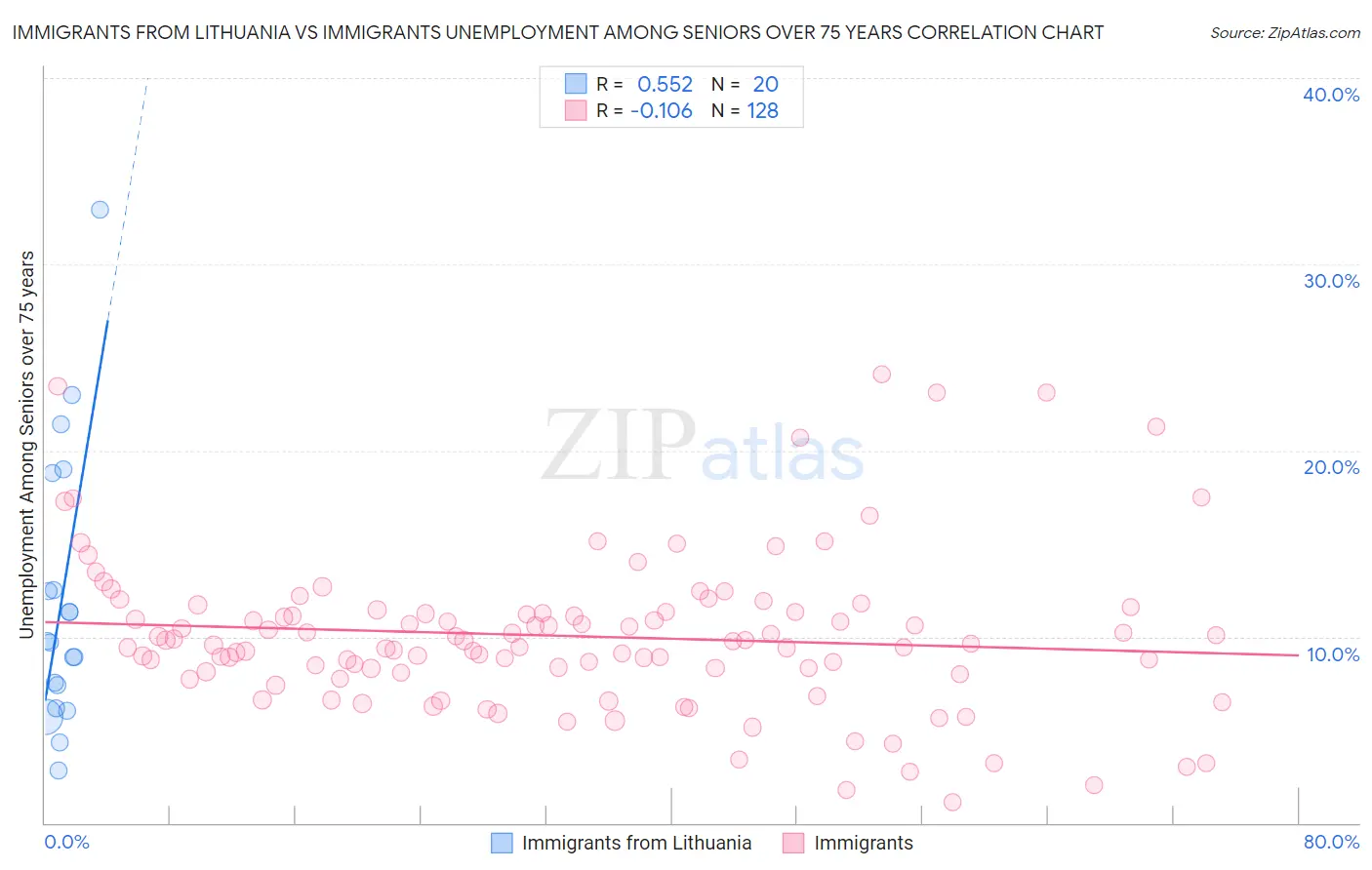 Immigrants from Lithuania vs Immigrants Unemployment Among Seniors over 75 years Correlation Chart