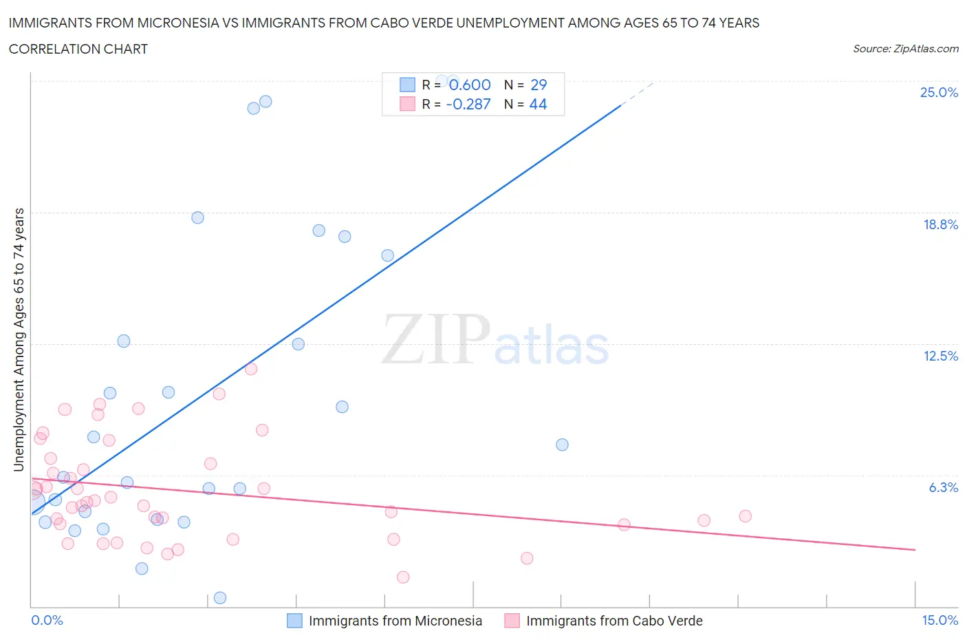 Immigrants from Micronesia vs Immigrants from Cabo Verde Unemployment Among Ages 65 to 74 years Correlation Chart