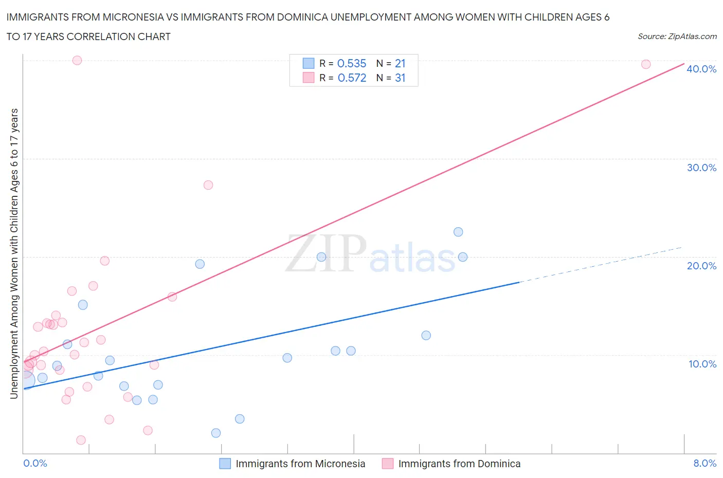 Immigrants from Micronesia vs Immigrants from Dominica Unemployment Among Women with Children Ages 6 to 17 years Correlation Chart