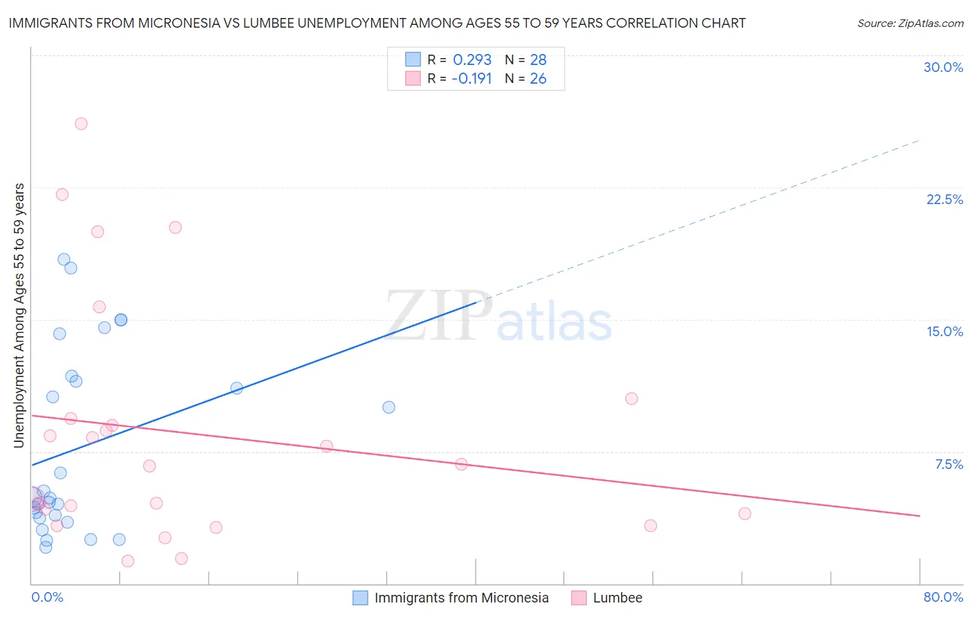 Immigrants from Micronesia vs Lumbee Unemployment Among Ages 55 to 59 years Correlation Chart