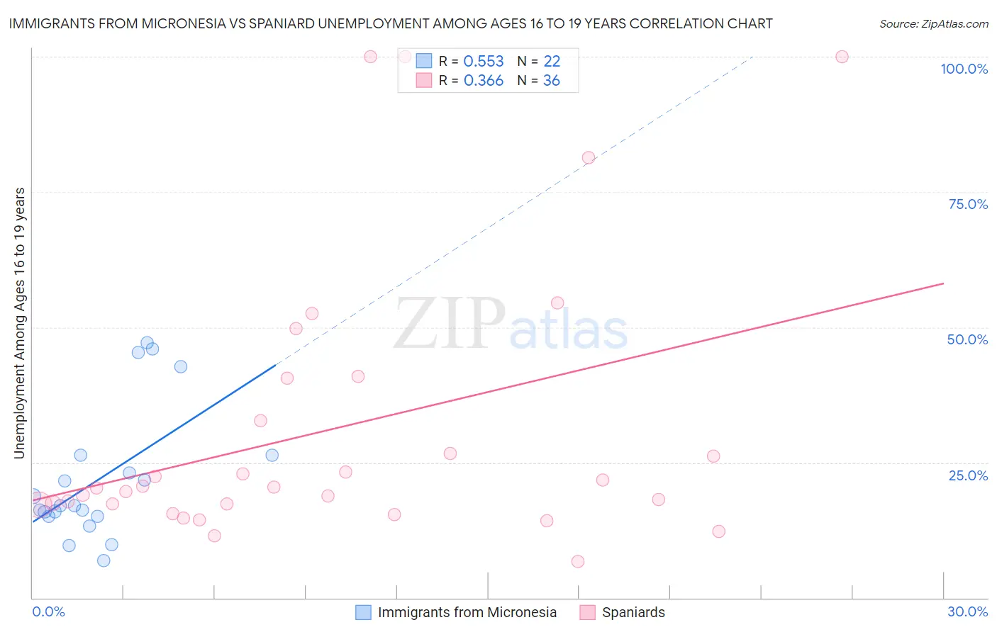 Immigrants from Micronesia vs Spaniard Unemployment Among Ages 16 to 19 years Correlation Chart