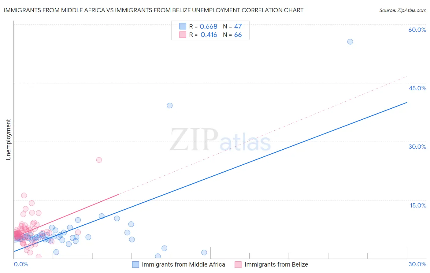Immigrants from Middle Africa vs Immigrants from Belize Unemployment Correlation Chart